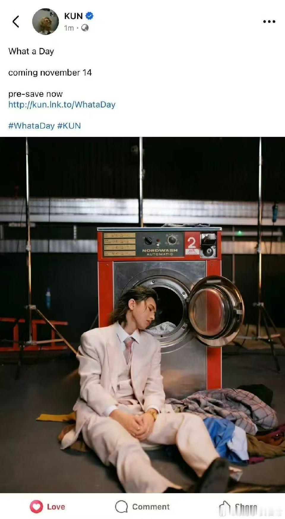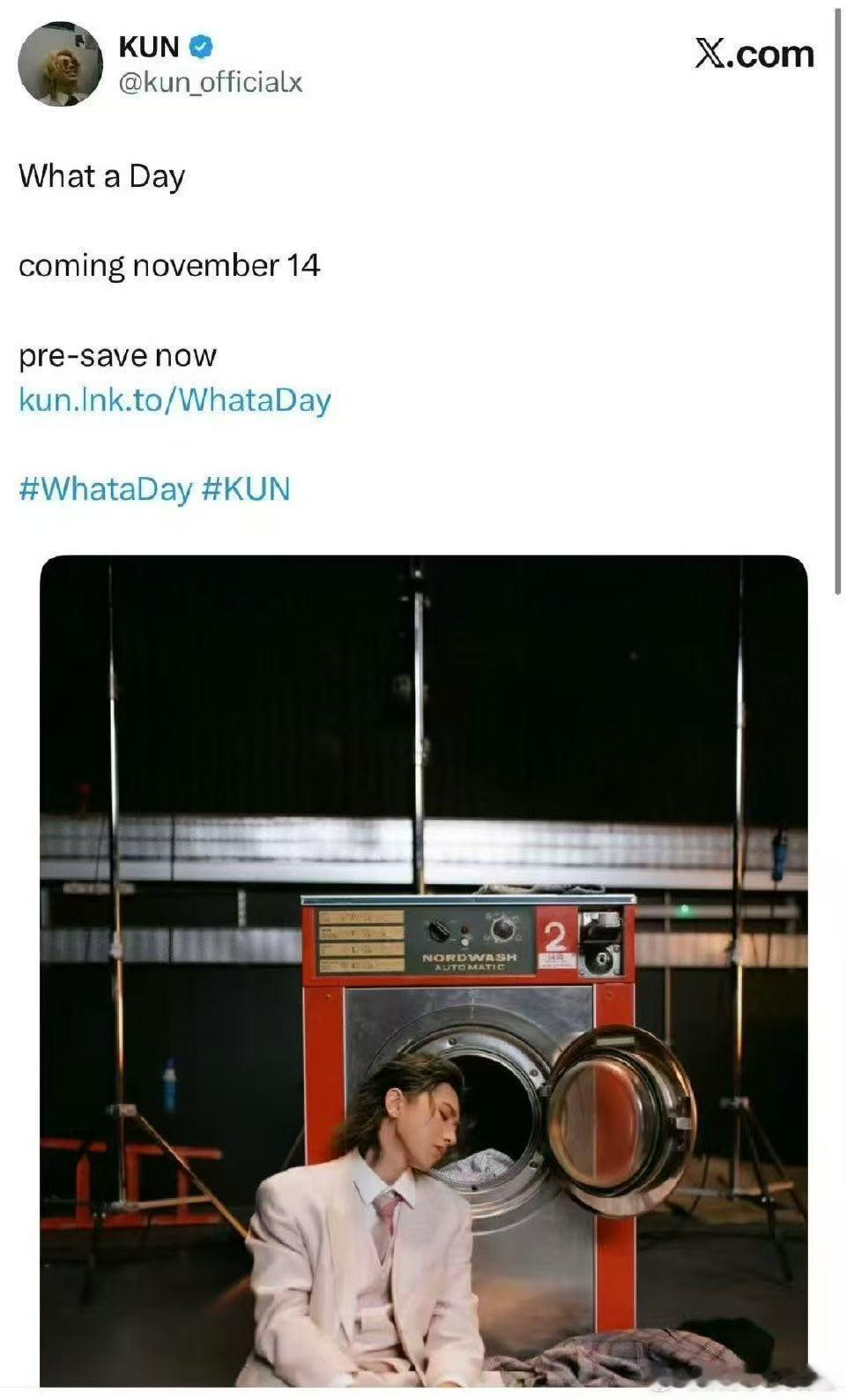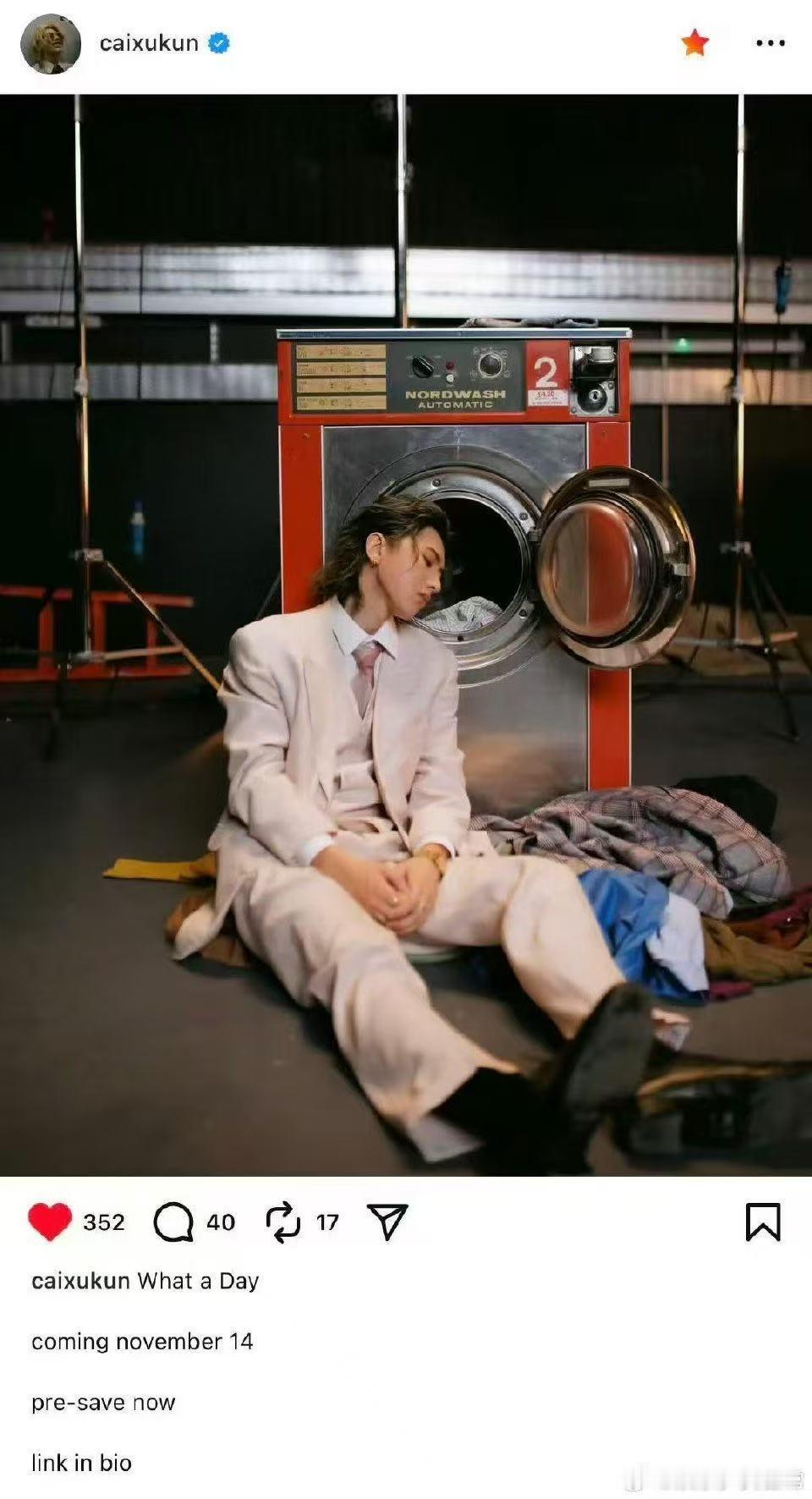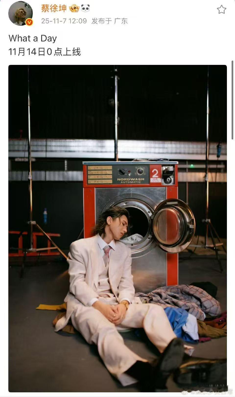 蔡徐坤新歌11月14号上线 蔡徐坤新歌《What a Day》官宣太让人激动!11月14日就能解锁顶级音乐享受,预告图里洗衣机前的白色西装复古造型氛围感拉满,品质免检的音乐,必须第一时间蹲守收听