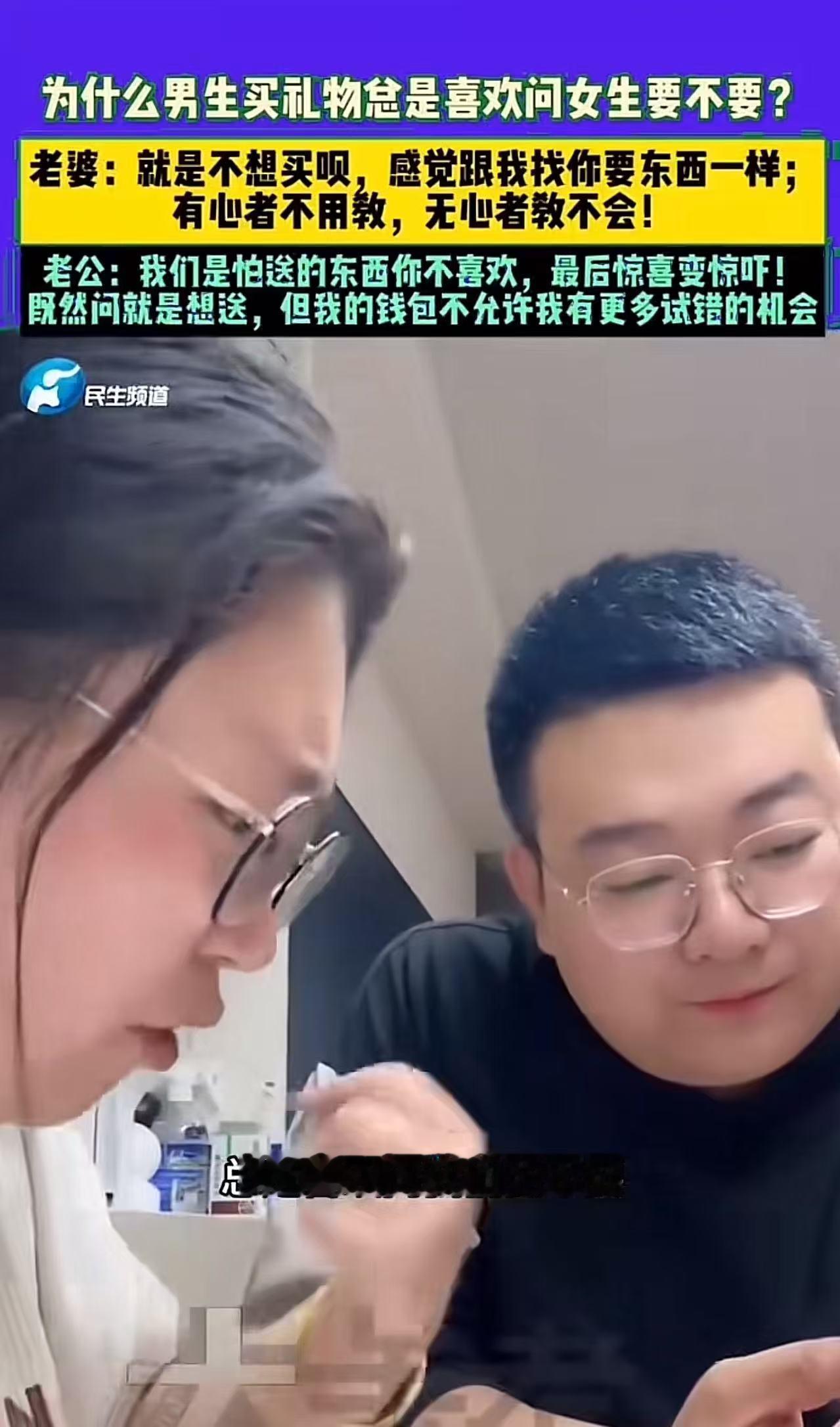 老婆怒斥:“为什么男生买礼物总是喜欢问女人要不要,就是不想买呗,感觉跟我找你要东西一样,有心者不用教,无心者教不会!”老公:男人真的太难了 !网友:当我老婆第一次给我说有心者不用教之后,我就再也没买过礼物! 老公想给老婆买礼物,但又不确定自己选择的礼物老婆是不是喜欢,就问老婆要不要! 可老婆却生气,觉得老公每次买东西都问要不要,一点惊喜都没有。 而且自己如果说要,又显得自己很想要似的,这不是让自己难堪吗? 于是这次老婆实在没忍住,就说了开头的话。 老公看老婆这样说,心里委屈极了,他说:“我不是舍不得送,我是怕我送的东西你不喜欢,反而惊喜变惊吓,这不是得不偿失吗?有的时候明明已经收到礼物了,上一秒还很开心,哎呀谢谢老公,结果下一秒打开礼物一看,就说你根本不懂我,不懂我就是不在乎我,不在乎我就是不爱我,咱俩就分手吧。最后再给你来一句,有心者不用教,无心者教不会! 礼物我明明送了,最后弄得咱俩生一肚子气。其实男生他真的没有你想的那么复杂,我既然问了就是想送,因为在我眼里,我认为你值得这世间所有的美好。但是现实就是我的钱包不允许我有这么多试错的机会!我希望给你花的每一分钱,都是有意义的……” 此事引发热议,有网友说,我媳妇就是这样,有心买个东西吧,买回来之后不是吵架就是受一肚子气,如果是吃的,就说买贵了,不爱吃,不想吃,不好吃,如果是衣服鞋子就说,长了,断了,款式不好,颜色不好,就是各种不爽,来十个快递能退七个,然后出去逢人就说我家那位从来给我不买啥东西,活着当着别人的面就说你看看人家的老公都买啥了,最后总结一句话就是,你给我钱我自己去买,唉! 也有网友说,我想要车,想要房子,想要包包,都是贵的,便宜的我都不喜欢,老公每次都找个替代品给我,我就把它退了,便宜的东西我宁愿不要, 还有网友说,因为他们不想买贵的,想买便宜的又怕老婆不高兴。其实发个520或1314的红包,资金足买个金项链、金手镯,我看那个女人会不高兴? 说实话,男人一直问你要不要时,他有两方面原因:1、他确实不舍得花那么多钱;2、如果你非要要,他愿意给你付钱,哪怕他再节俭点。 男生希望在自己经济条件允许的情况下,买到你喜欢的东西,就像男生说,他的钱包不允许他试错。 如果有钱,试错成本几乎没有。想送啥送啥,送错了扔了不要了,再送总能无限试错。没钱的,就希望送的有价值,这个钱花的值花的高兴。 可惜,世界唯一一个男人送什么她都高兴的女人,只有母亲。路边的野花,小摊子上几块钱的发夹等等,都能让她高兴半天,因为这是她的儿子送给她的! 最后提醒女人,男生说的话就是字面意思,你就按字面意思理解就行,不要掺杂太多自己的心思……