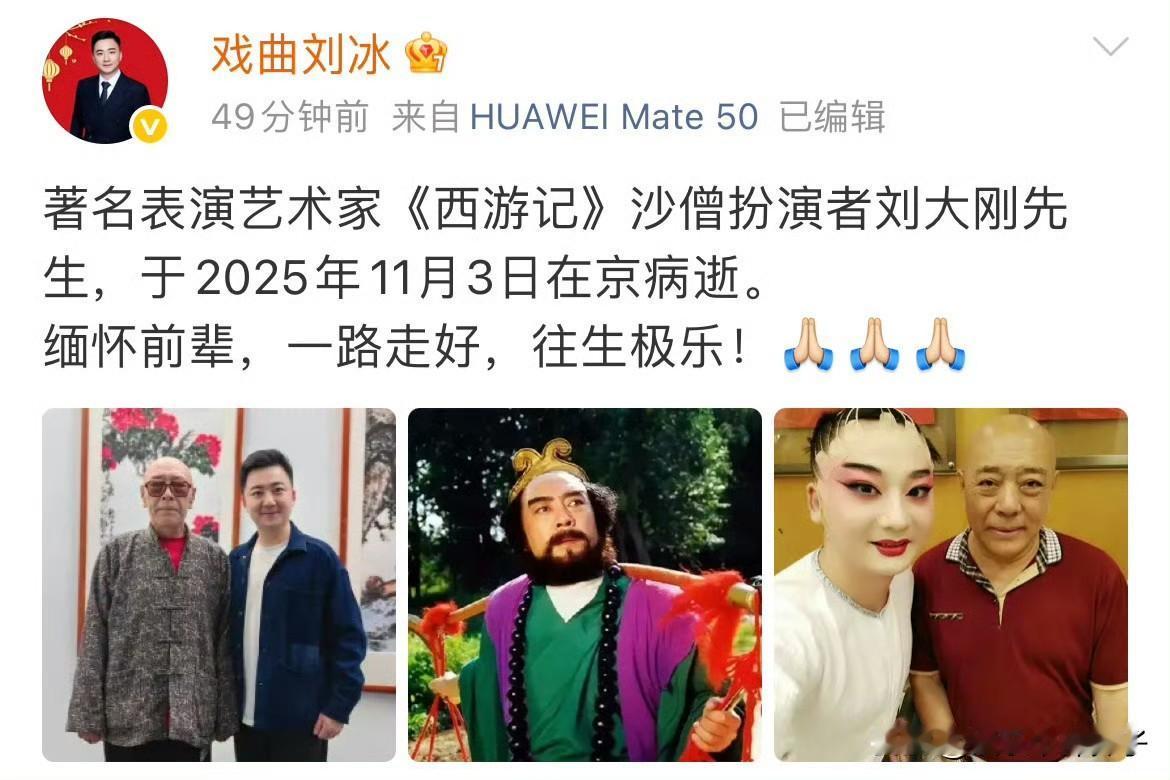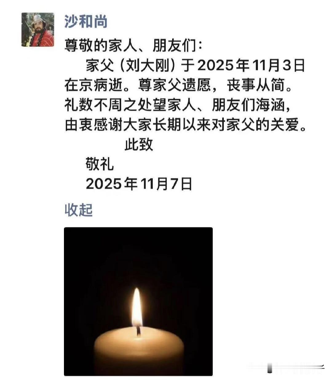 《西游记》续集沙僧扮演者刘大刚病逝! 11月7日,娱乐圈传来噩耗,戏曲演员刘冰 在社交平台发文,透露表演艺术家刘大刚病逝,享年78岁,言语中充满不舍,深切缅怀前辈。 随后,儿子发布讣告,表示尊重家父遗愿,丧事从简。 刘大刚饰演的沙僧,是一个吃苦耐劳,老实巴交的角色,看照片,生活中也是一位慈祥的老人。 饰演沙僧的闫怀礼老师走了,刘大刚老爷子也走了,让人深感悲痛。 愿逝者安息,一路走好!