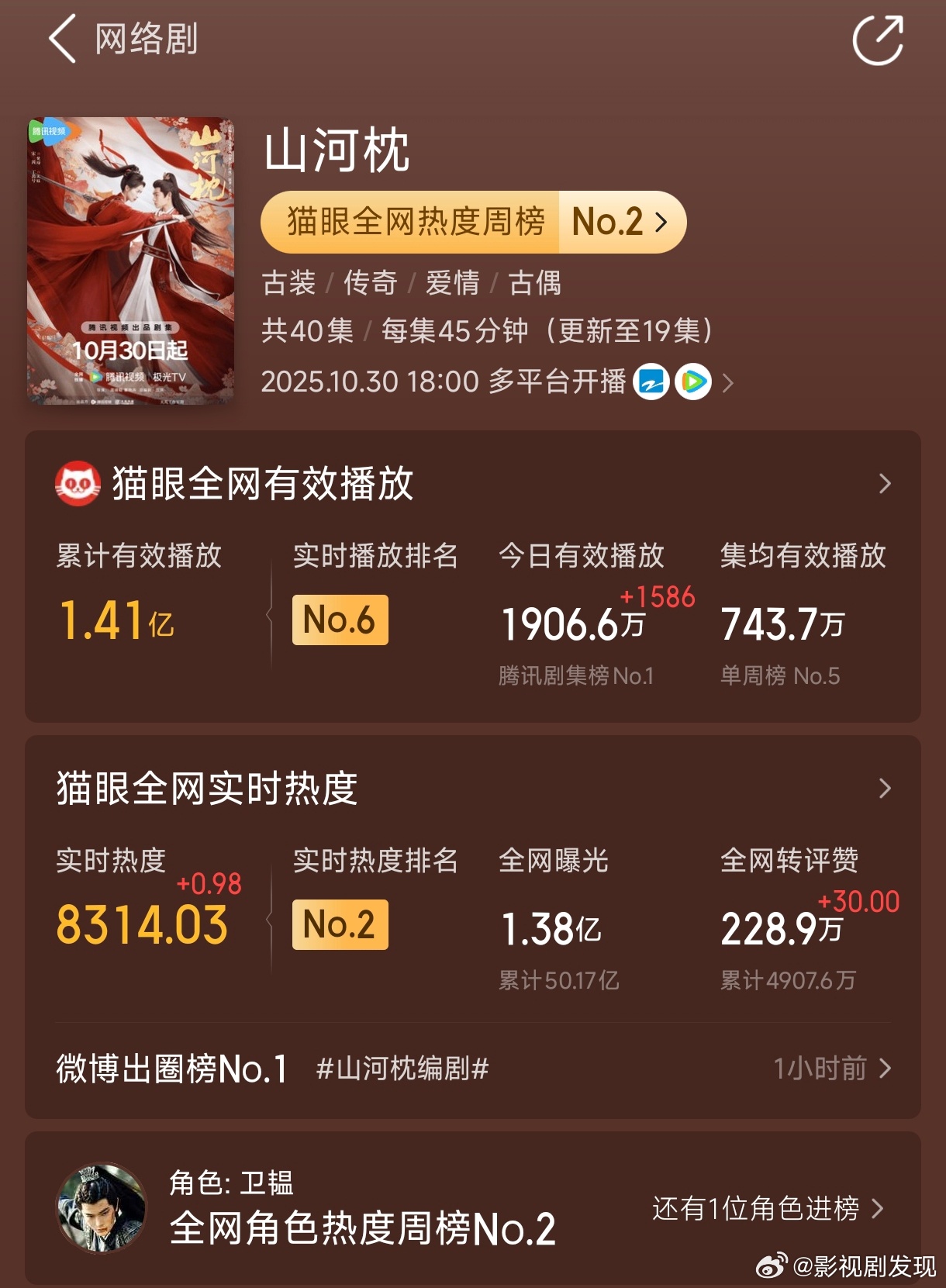 山河枕编剧从一开始就觉得很多地方逻辑不同,很多设定无法让观众相信,从播出效果看也确实表现一般,到现在热度最高只有25000,播放量集均还不到800万[摊手]卫韫 你养我
