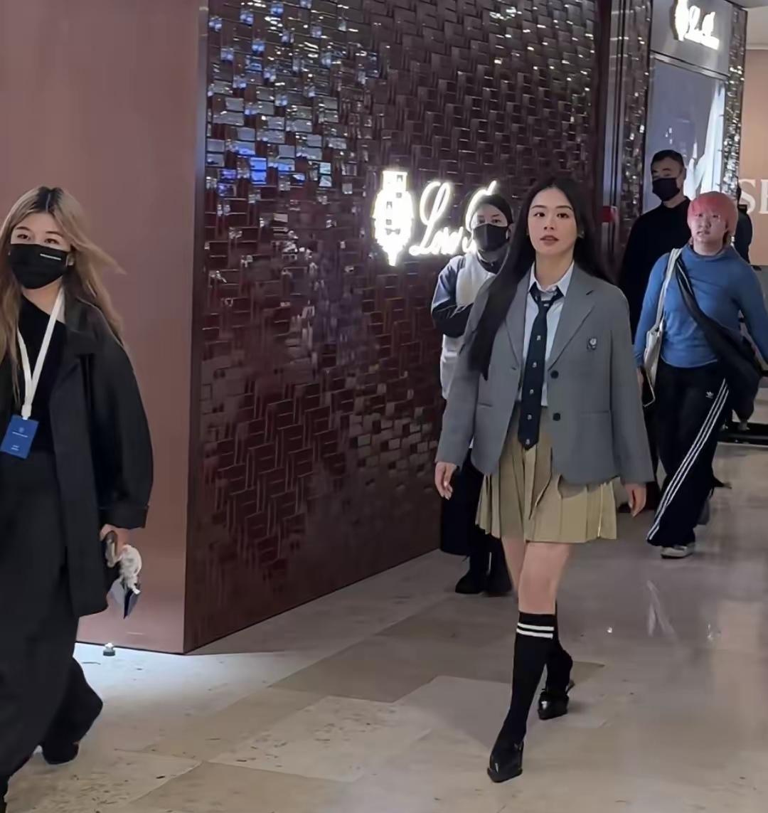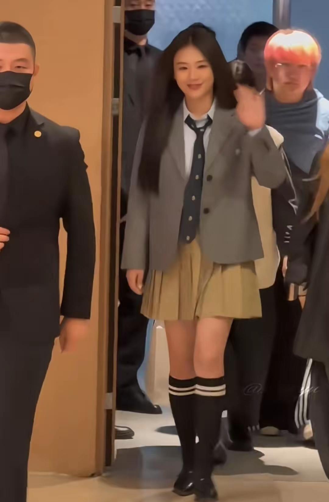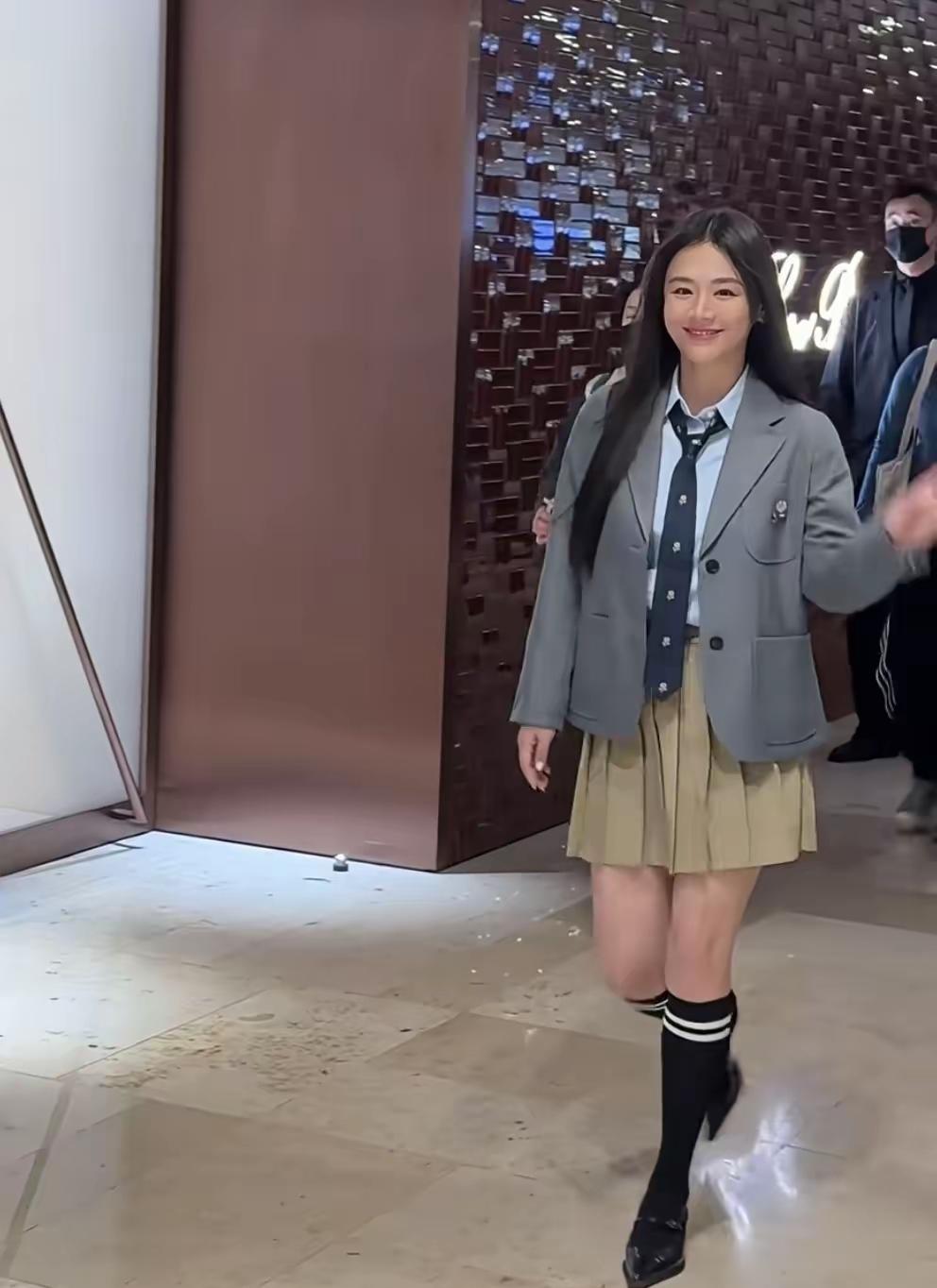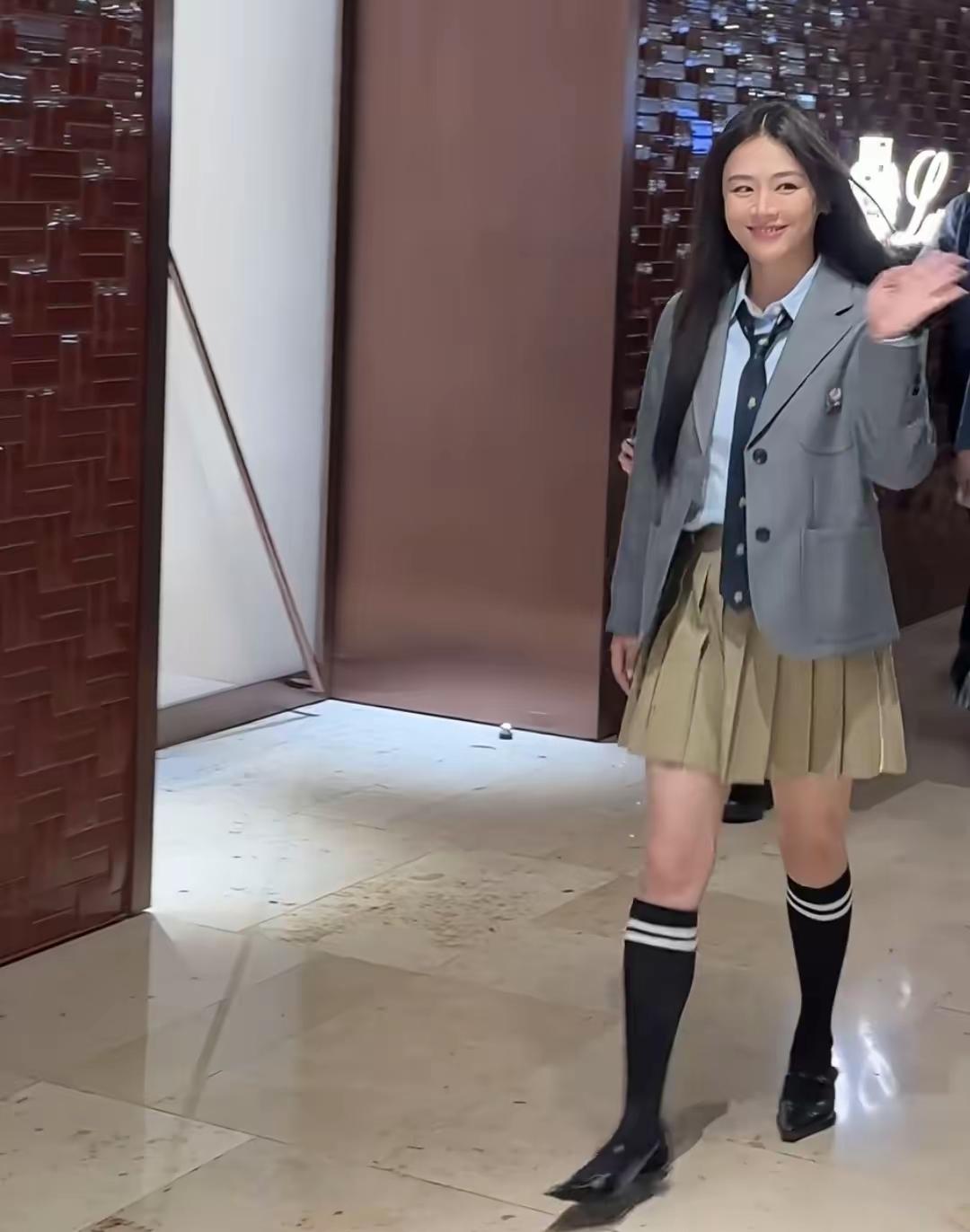 马思纯惊艳亮相南京德基出席活动! 镜头下的她,一袭学院风穿搭显得活力,阳光四射! 马思纯这次身穿灰色西服,内搭白色衬衣搭配领带,下搭卡其色百褶裙,脚踩黑色高筒长袜,秀出笔直纤细的大长腿,这造型被网友夸爆了! 入场的时候,挥手与网友热情打招呼,满脸笑容,顺直长发披肩,又美又甜,美的令人陶醉!