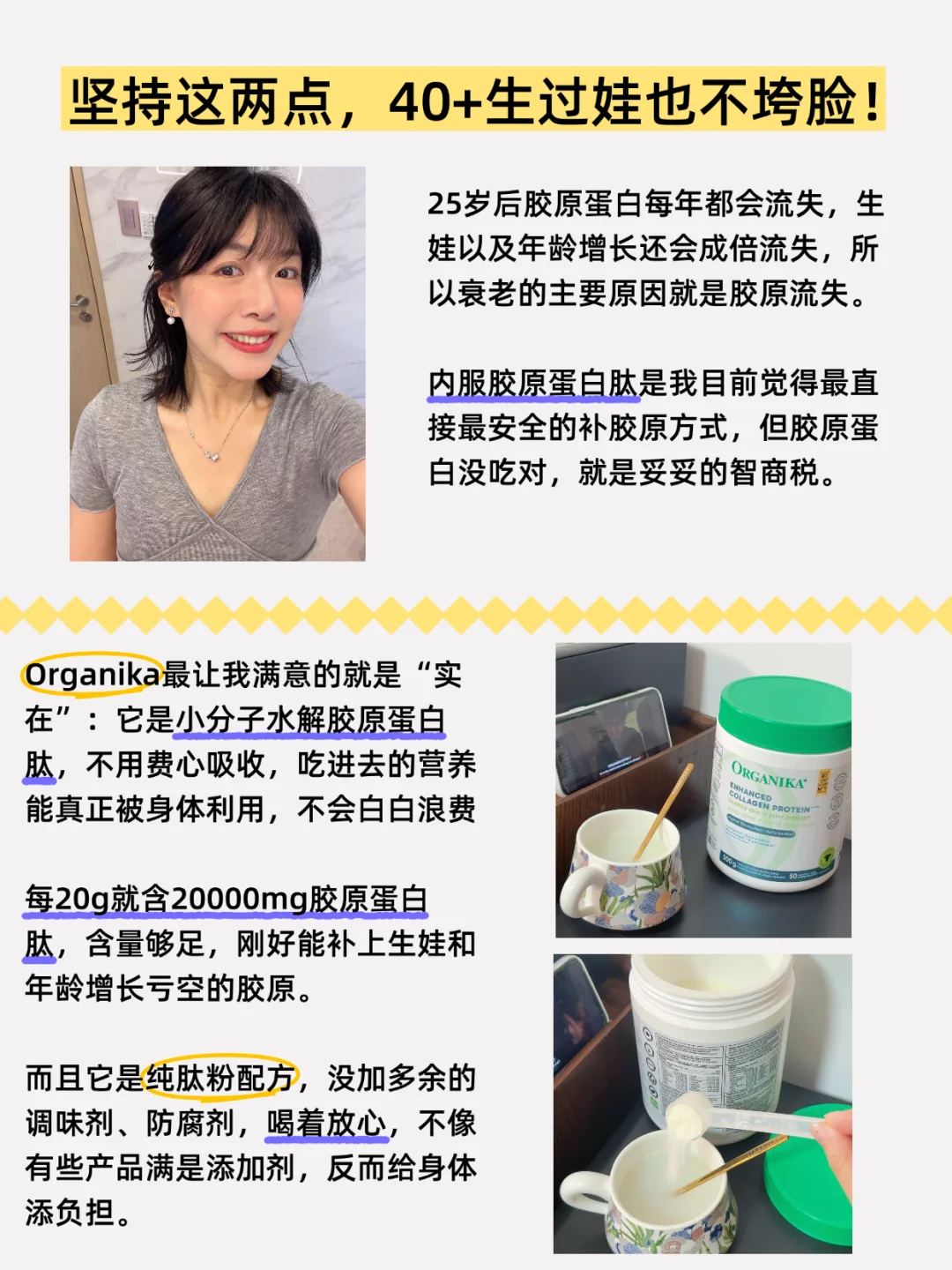 很多人都说生孩子会让女人老十岁,我今年40岁,生过娃,但皮肤依然紧致饱满,素颜状态也很好;很多人说有30岁后皮肤断崖式衰老的问题,我很庆幸自己从25岁开始就有抗衰意识,坚持控糖+补胶原,在目前没do脸、生过娃的前提下,状态依然很好。 - 跟大家分享我这几年的经验,25岁以上尤其是30岁以上的姐妹都可以参考。 首先,控糖是基础,过度摄入糖分会在身体形成AGES,破坏胶原蛋白,脸色发黄发暗就是从这里开始,很多姐妹觉得护肤品用一堆都不见效果,就是因为皮肤糖化太严重。 奶茶一定要戒掉,少吃蛋糕等精加工甜食,可以多吃粗粮(玉米、红薯),多补充蛋白质,如牛肉、鱼虾等,水果一天可以吃250克,坚持下去几个月就能看到效果,护肤会事半功倍哦!控糖初期会有一丢丢不适应,坚持下去就会收获好皮肤好身材! - 其次,狂补胶原就对了!25岁后胶原蛋白每年都会流失,生娃以及年龄增长还会成倍流失,所以衰老的主要原因就是胶原流失。 内服胶原蛋白肽是我目前觉得最直接最安全的补胶原方式,但胶原蛋白没吃对,就是妥妥的智商税。 - 这些年我淘汰过不少胶原产品,饮剂、片剂都试过,市面上叫得出名字的几乎都没落下,直到选了Organika胶原蛋白肽,才算真正入对了坑,这是我认真对比后留下的,实实在在看到皮肤变紧致,绝不是心理作用。这几年身边朋友总说我不像生过娃的,皮肤状态比孕前还好。 - Organika最让我满意的就是“实在”:它是小分子水解胶原蛋白肽,不用费心吸收,吃进去的营养能真正被身体利用,不会白白浪费;每20g就含20000mg胶原蛋白肽,含量够足,刚好能补上生娃和年龄增长亏空的胶原。而且它是纯肽粉配方,没加多余的调味剂、防腐剂,喝着放心,不像有些产品满是添加剂,反而给身体添负担。 - 之前还担心粉剂冲调麻烦,后来发现它冲泡起来还挺百搭便利的,单冲温水会有点淡腥味,但加进果汁、拌入冰咖啡里,腥味立马中和,喝着像带胶原的特调饮品,每天冲一杯都不觉得是“任务”。没有花里胡哨的多余成分,专注把核心胶原补到位,反而更适合我这种带娃忙、追求实在效果的宝妈。 - 哪个女生不想要自然的嘭弹肌?就算生了娃过了30岁,谁又想面临“垮脸”呢?,想变美的姐妹们,真的可以试试从控糖+喝Organika胶原肽开始,不用do脸,也能稳住好状态~