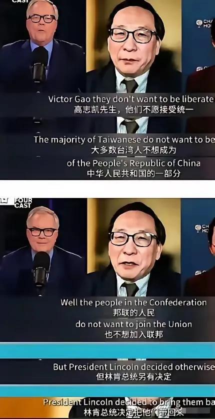 一位美国专家提问高志凯:大多数台湾人不想成为中华人民共和国的一部分,他们不愿意接受统一怎么办?高志凯教授回答:那我们就学你们歌颂崇拜的林肯总统,如果没有不同意见,美国就没有南北战争了。林肯总统不惜发动一场血流成河的战争,也不愿意美国分裂,也要实现美国南北统一。美国专家听后面红耳赤,哑口无言。