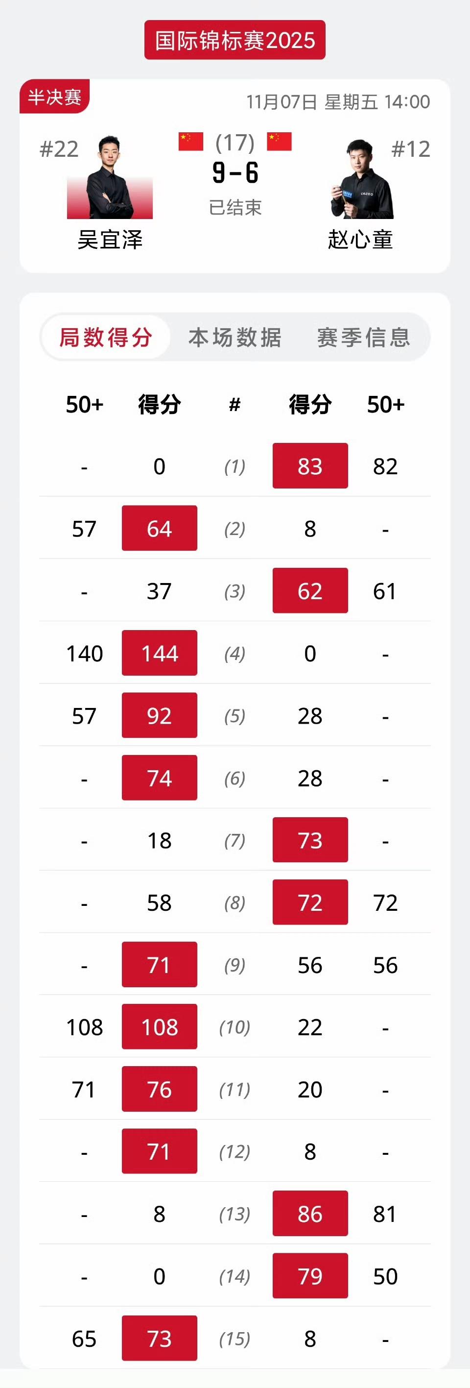 9-6!吴宜泽力克世界冠军赵心童晋级国锦赛决赛!也许这将是吴宜泽的蜕变之战。 1/8决赛对阵世界第一特鲁姆普,吴宜泽0-4落后,随即打出6连鞭,最终6-4翻盘。 1/4决赛对阵霍金斯,直接6连鞭收割比赛。 半决赛对阵赵心童,4-4战平后,下半场随即打出4连鞭拿到赛点,尽管赵公子扳回2局,但第15还是犯了错误,吴宜泽最终9-6击败赵心童晋级决赛。