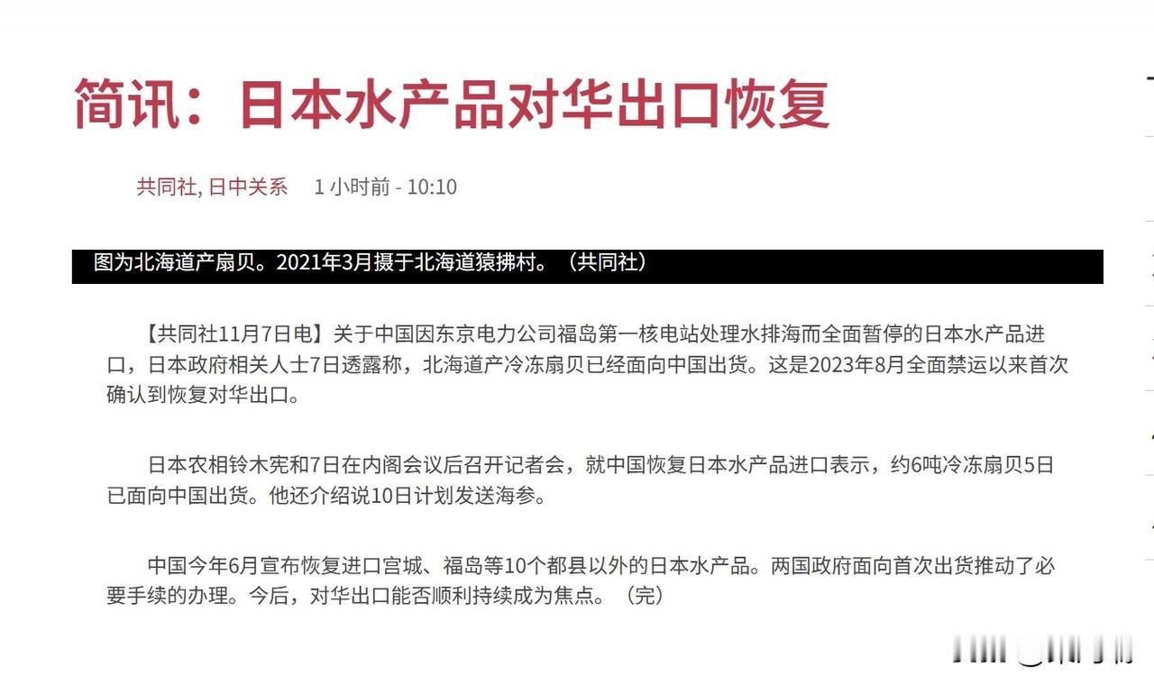 据日本共同社报道,约六吨日本北海道冷冻扇贝已向中国出货,这是2023年8月中国全面暂停进口日本水产品后,首次有日本水产品恢复对华出口。 日本新任农林水产大臣铃木宪和11月7日在内阁会议后召开记者会,就中国恢复日本水产品进口表示,约六吨冷冻扇贝星期三(11月5日)已向中国出货,下星期一(11月10日)还计划发送海参。 报道称,中日两国政府面向首次出货推动了必要手续的办理,今后对华出口能否顺利持续成为焦点。