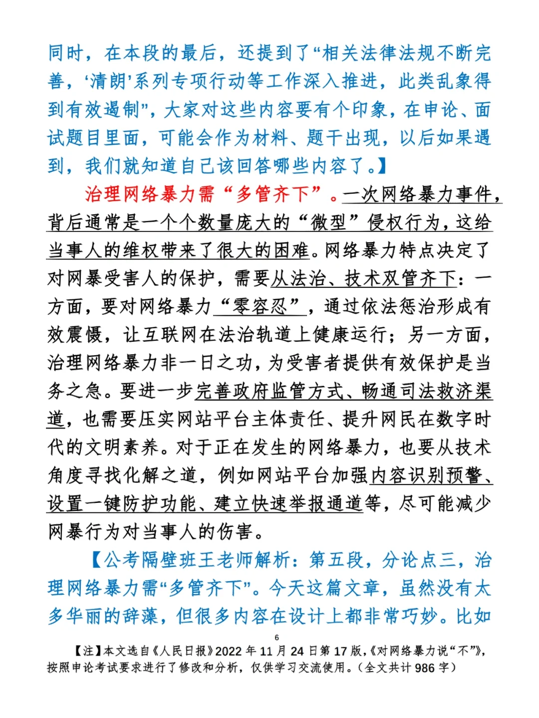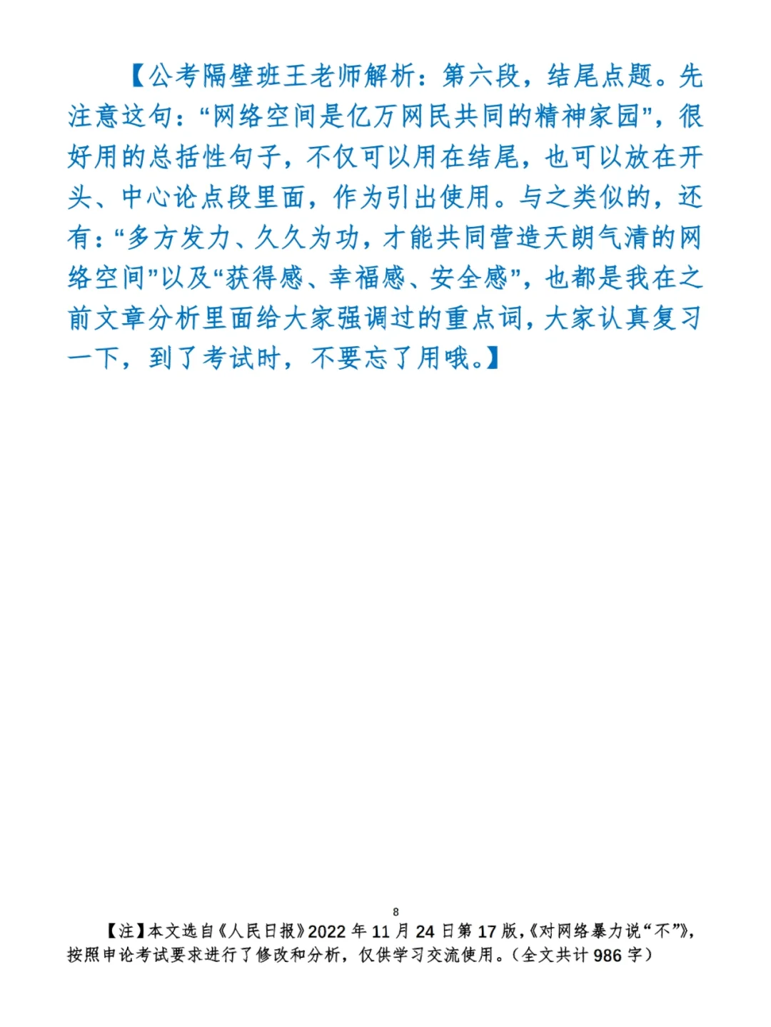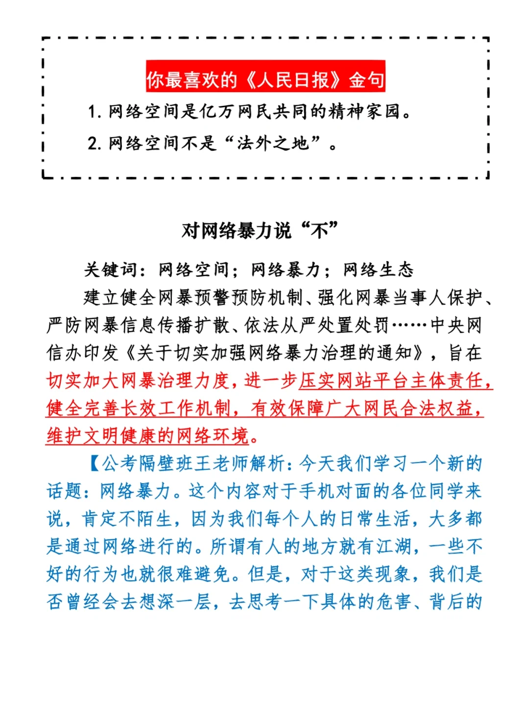 今日打卡作业: 1. 选一句你最喜欢的金句 2. 抄写全文红字+划线部分内容 3. 写完后在留言区打卡 ⭐️ ⭐️ ⭐️ ⭐️ ⭐️ ⭐️ 如何抄写:每天的抄写文章以图片形式发在“公考隔壁班王老师”账号,红色字是重点句和结构句,黑色字是正文,蓝色字是解析,大家抄写时不必抄蓝色字。建议先通读全文(包括蓝色解析部分),做到心中有数再开始抄写,效果会更好。 关于文章:抄写文章来源于人民日报,但每篇文章我都根据申论考试要求进行了修改,主要集中在四个方面:一是重写或修改开头、结尾;二是统一段首句句式结构;三是调整段落字数,使文章结构更均衡;四是简化复杂长难句,使之更具可模仿性。每篇文章修改幅度不同,无论修改多少,都是基于申论考试要求,毫无对人民日报文章品评之意。(此处致敬人民日报) 关于解析:我会在文章每段后面加一段蓝色字的解析,是我自己在抄写时的感悟,篇幅时间有限,不能面面俱到,但求重点突出。如果你有其他感悟,也希望能在评论里分享,我们相互学习、共同进步。 ⭐️ ⭐️ ⭐️ ⭐️ ⭐️ ⭐️ 这里是公考隔壁班王老师独创的“每天半小时・申论80分”抄写团,欢迎加入我们!