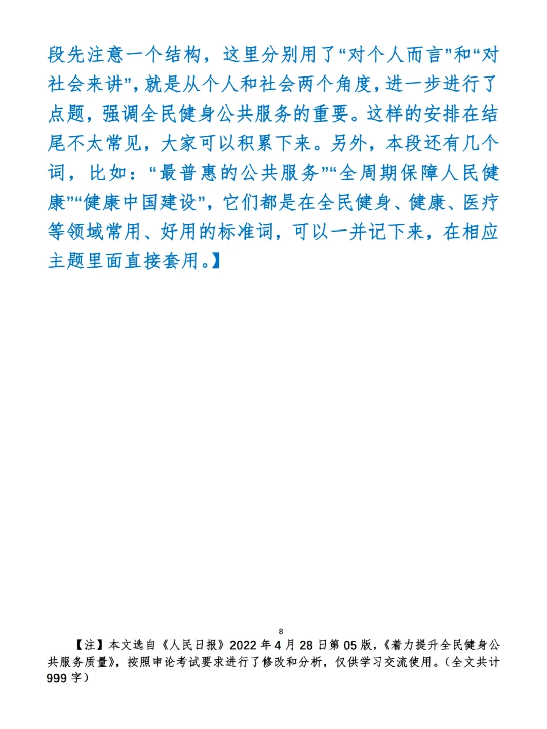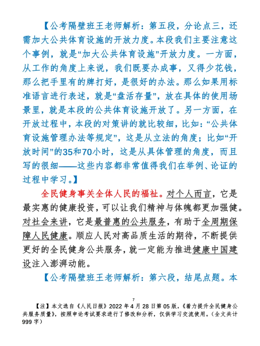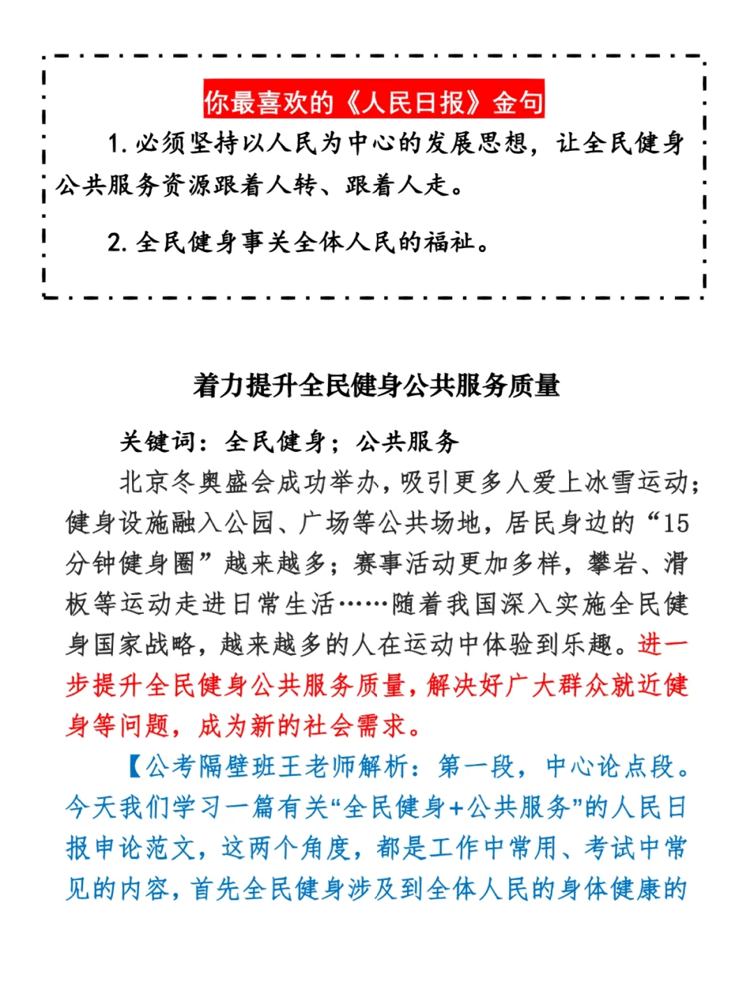 如何抄写:每天的抄写文章以图片形式发在“公考隔壁班王老师”账号,红色字是重点句和结构句,黑色字是正文,蓝色字是解析,大家抄写时不必抄蓝色字。建议先通读全文(包括蓝色解析部分),做到心中有数再开始抄写,效果会更好。 关于文章:抄写文章来源于人民日报,但每篇文章我都根据申论考试要求进行了修改,主要集中在四个方面:一是重写或修改开头、结尾;二是统一段首句句式结构;三是调整段落字数,使文章结构更均衡;四是简化复杂长难句,使之更具可模仿性。每篇文章修改幅度不同,无论修改多少,都是基于申论考试要求,毫无对人民日报文章品评之意。(此处致敬人民日报) 关于解析:我会在文章每段后面加一段蓝色字的解析,是我自己在抄写时的感悟,篇幅时间有限,不能面面俱到,但求重点突出。如果你有其他感悟,也希望能在评论里分享,我们相互学习、共同进步。 ⭐️ ⭐️ ⭐️ ⭐️ ⭐️ ⭐️ 这里是公考隔壁班王老师独创的“每天半小时・申论80分”抄写团,欢迎加入我们!