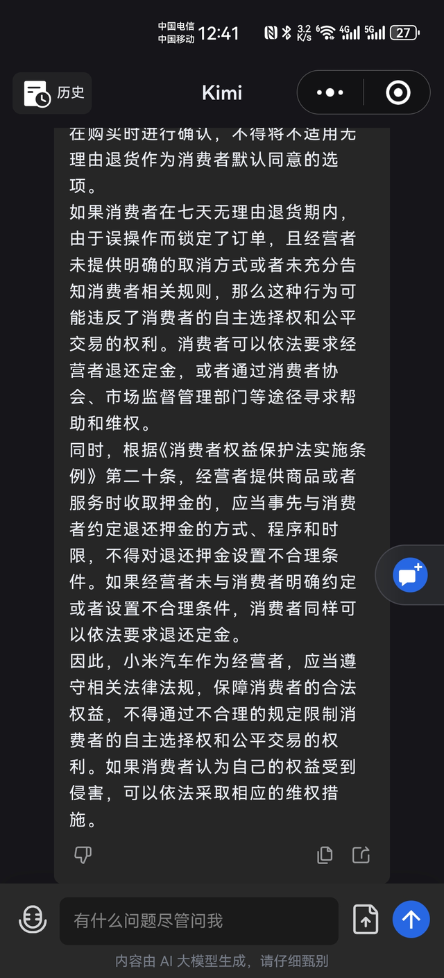 误操作点击锁单,小米客服回复定金不退! 在小米汽车APP下了定金,心想买的人肯定比较多,为了提车排期靠前,就支付了定金,由于没有征求家人意见,配置还需要调整,就调整了半天,我也不知道怎么搞的,误击了确认锁单,结果配置也无法更改,昨天到今天一直打小米客服,就是打不通,可能咨询的人太多了吧,终于到今天12点打通了,客服回复确认了锁定定金是不退5000元定金的,我也是醉了!他的APP上面就没有说明犹豫期锁单不退定金的问题,真是无语😑难道要走法律程序来维权吗?