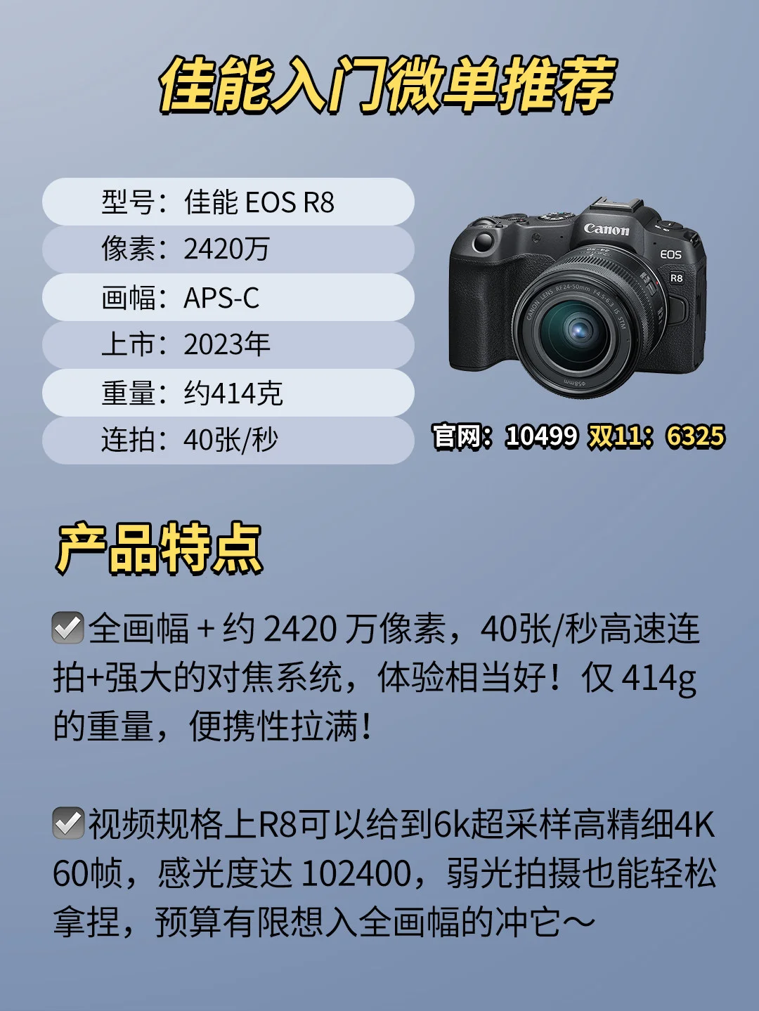 全画幅 + 约 2420 万像素,40张/秒高速连拍+强大的对焦系统,体验相当好!仅 414g 的重量,便携性拉满!视频规格上R8可以给到6k超采样高精细4K 60帧,感光度达 102400,弱光拍摄也能轻松拿捏,预算有限想入全画幅的冲它~