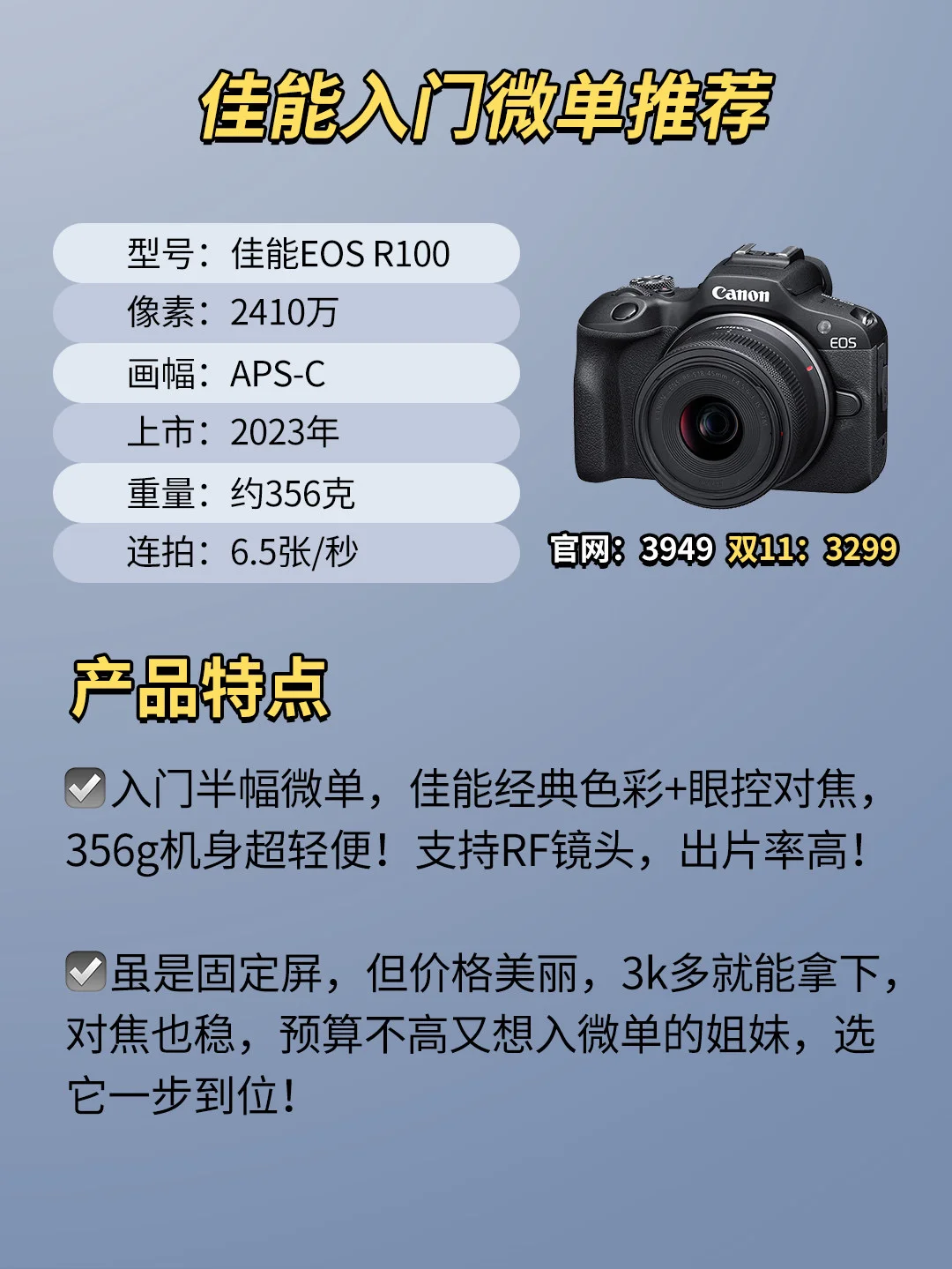 入门半幅微单,佳能经典色彩+眼控对焦,356g 机身超轻便!支持RF镜头,出片率高!虽是固定屏,但价格美丽,3k多就能拿下,对焦也稳,预算不高又想入微单的姐妹,选它一步到位!