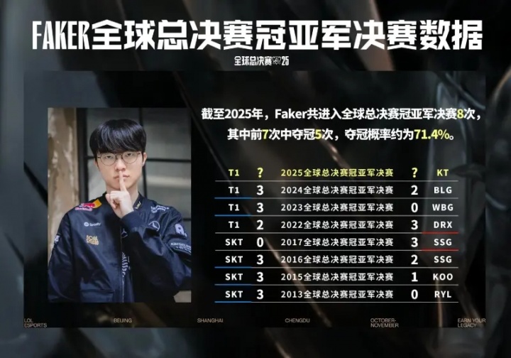 截至2025年,Faker共进入全球总决赛冠亚军决赛8次,其中前7次中夺冠5次,夺冠概率约为71.4%。