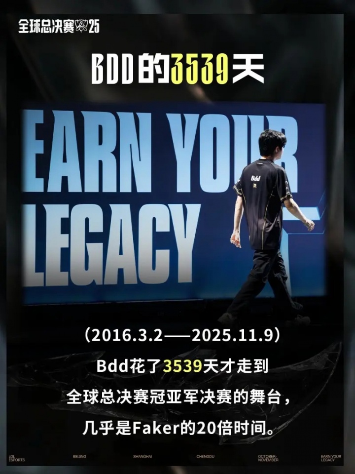 Bdd花了3539天(2016.3.2——2025.11.9)才走到全球总决赛冠亚军决赛的决赛舞台,几乎是Faker的20倍时间(2013.4.6——2013.10.4,181天);