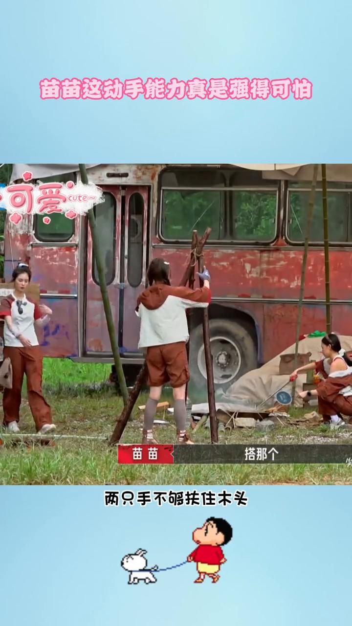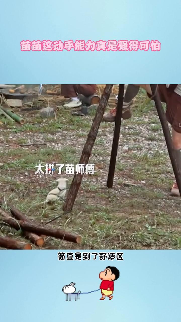 苗苗这动手能力真是强得可怕。 苗苗这动手能力真是强的可怕。综艺里苗苗为营地搭建置物架,两只手不够扶住木头,他直接上腿当第三只手,展现高难度搭建置物架。不愧是学舞蹈的,简直太帅了。感觉苗苗参加这个节目简直是到了舒适区。 可能因为我在家的时候没有这个条件,反而来了这,我会觉得在这有这么高的木材可以让我随便用,所以就有点停不下来,就想一直做,这样一直走。