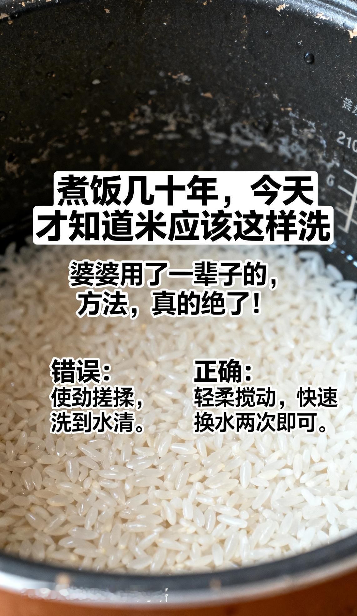 煮饭几十年,今天才知道米应该这样洗 婆婆用了一辈子的方法,真的绝了! 错误:使劲搓揉,洗到水清。 正确:轻柔搅动,快速换水两次即可。 营养和香味都被你搓没啦!这样煮出来的米饭,粒粒分明,米香十足。不信你今晚试试! 是不是每个家庭都有个“淘米强迫症”长辈?总觉得水不澄清就是没洗干净,双手使劲搓揉三分钟,恨不得把米粒搓出包浆才放心。可你不知道,这传承了几十年的习惯,早就被现代科学打脸了!中国农业大学的实验数据显示,用力搓洗三分钟,大米里的维生素B1流失率高达42%,相当于把半碗营养直接倒进下水道。 老一辈的“干净执念”其实源于过去的时代局限。以前大米加工粗糙,混着稻壳、石子是常事,“三洗三搓”确实必要。但现在的大米要经过脱壳、筛选、打磨、抛光等12道工序,出厂前还要过三次质检,杂质含量比一粒沙子还轻,根本没必要反复清洗。那些你以为的“脏水”,其实是米糠层溶解的营养精华,里面藏着B族维生素、膳食纤维这些宝贝,遇水就容易“跑路”。 更扎心的是,过度淘米不仅浪费营养,还可能伤手又粘锅。皮肤科医生发现,频繁用淘米水搓洗会破坏手部皮肤屏障,引发干燥脱皮的“家庭主妇手”;而被搓出划痕的米粒,煮的时候更容易糊锅,锅底的饭痂刷都刷不掉。北京协和医院营养科主任更直言,每天吃的米若经5次强力搓洗,流失的营养相当于2个鸡蛋,长期下来容易让人疲劳没力气。 不同人群还有专属淘洗技巧:新手爸妈给宝宝做辅食,选正规品牌宝宝米,只需1次轻冲,泡米水别倒,煮粥更营养;爱吃糙米的朋友,先挑掉碎米,轻淘1-2次后浸泡8小时,煮出来软糯不夹生;就算赶时间,也别信“免淘米”能直接吃,略冲3秒去除浮尘更安心。 其实淘米就像对待易碎的瓷器,掌心轻轻画圈搅动,换两次水就行,不用追求水清。今晚做饭就试试这个方法,你会发现米饭的米香比以前浓郁太多,粒粒分明还不粘牙。快@你家那位爱使劲淘米的人,别再让“干净误区”偷走营养啦!