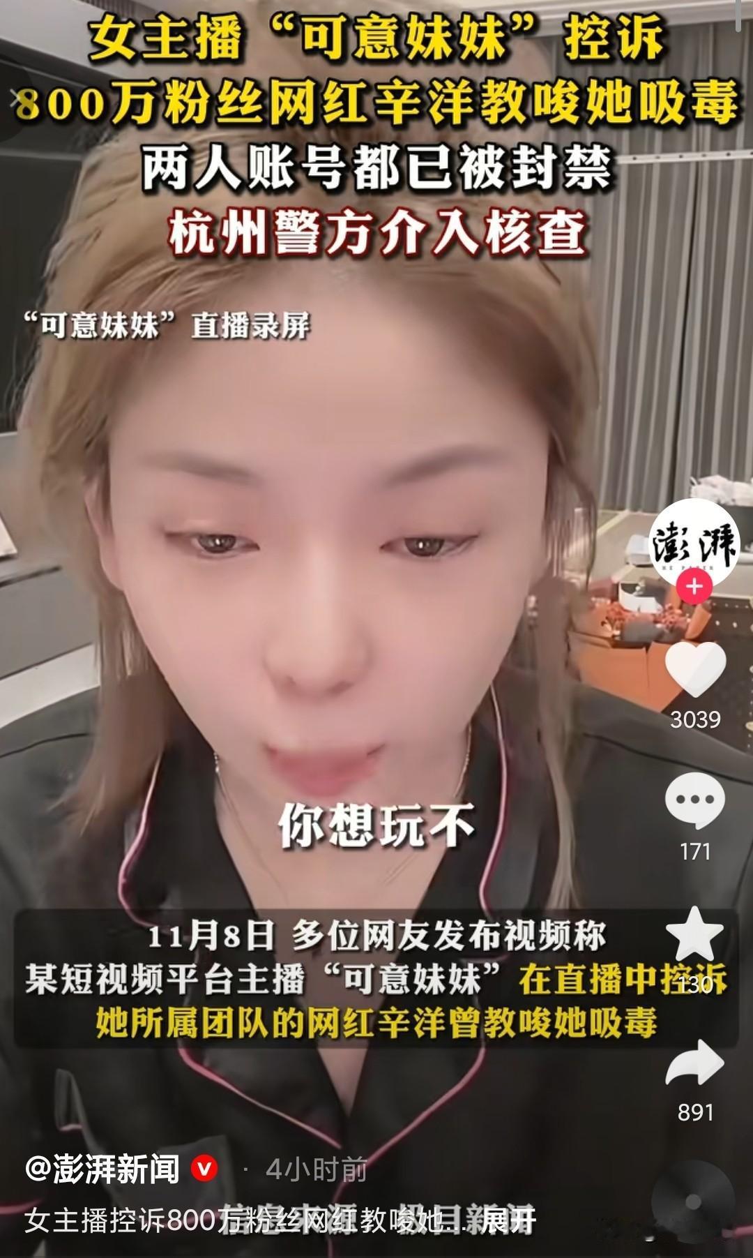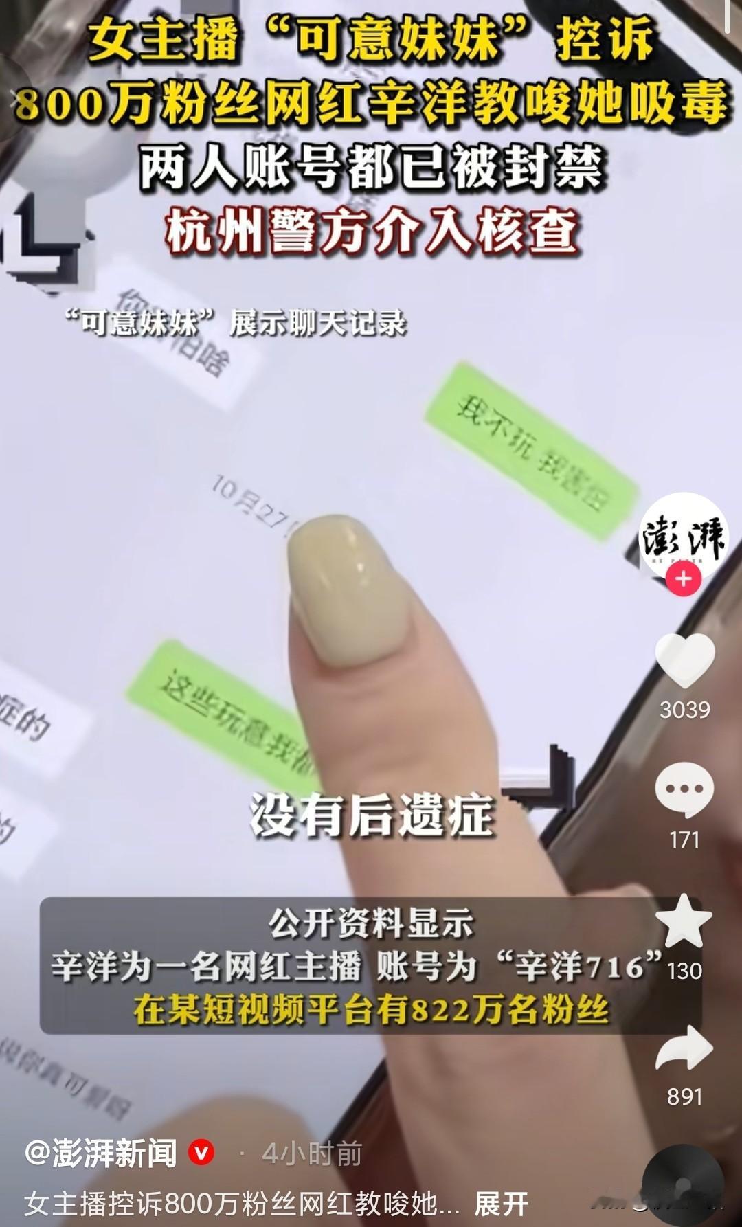 800万粉丝“辛洋”教唆她人吸毒, 目前两人的账号全被封禁,有待调查。 2025年11月8日凌晨,某短视频平台主播“可意妹妹”的一场直播爆出了猛料,无法控制住自己的情绪,在面对镜头面前哭诉,控诉自己团队核心成员,822万粉丝的网红“辛洋716”,多次教唆吸毒。 从曝光的聊天记录中,看到了他有意无意的引导,可意妹妹反复表示“我不玩,我害怕”,而辛洋却持续施压,以“没有后遗症,很舒服”进行诱导,还用她的师傅压她,逼迫她就范。 他们整个团队都应该验血,这里面到底有多少人接触了毒品。 是火了才飘的,还是本性如此,粉丝们托举她们,赚钱了干些违法事情,影响社会风气,为了追求刺激,想想牺牲了多少缉毒警察,他们毒品又是哪里来的。 网络不是法外之地,期待杭州警方早日查明真相。