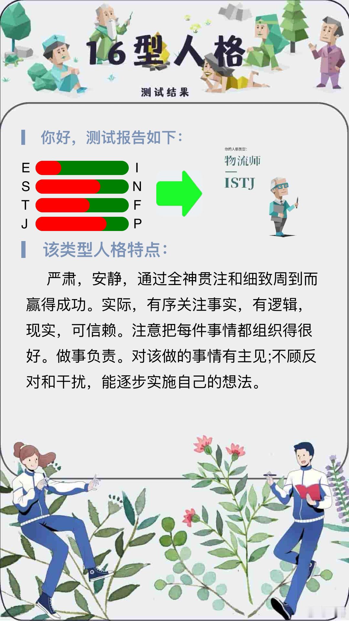 今天跟朋友聊天才发现,我的人格居然是ISTJ!一测还真准~我那种出门前要查好路线、行程要列清单、跟人约时间一定提前到、遇到问题第一反应是想办法解决的人。