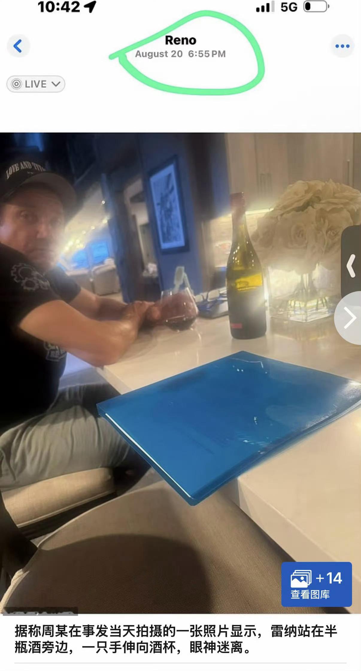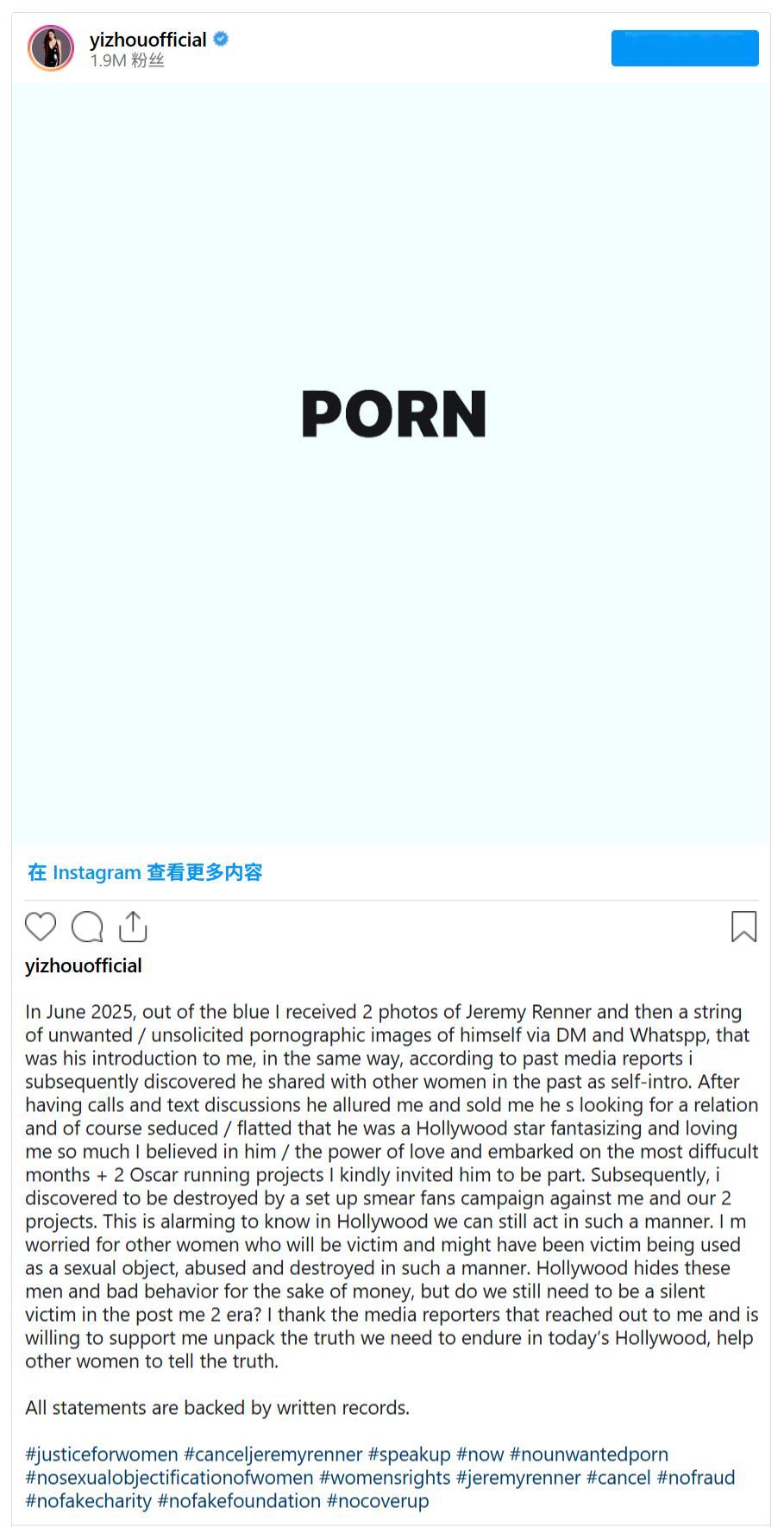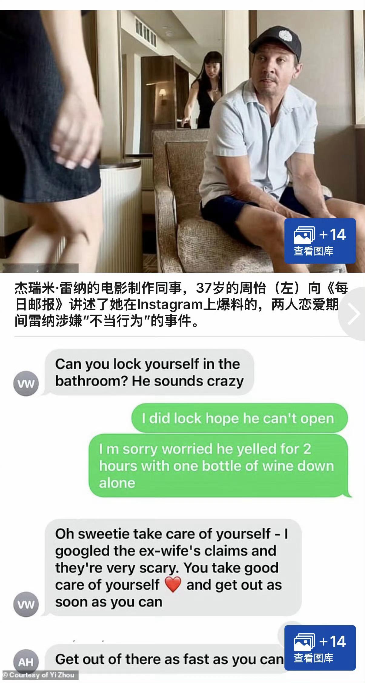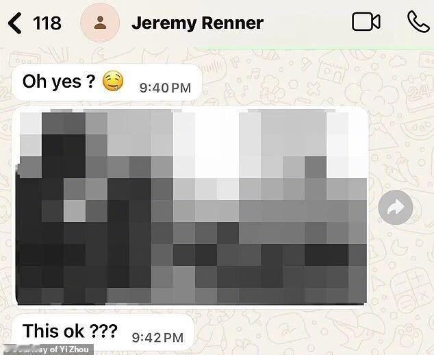 周依在接受《每日邮报》采访时表示,两人在2025 年 6 月相识,那天她毫无征兆地收到了两张 Renner 的照片,紧接着就是一串他的不雅自拍照。