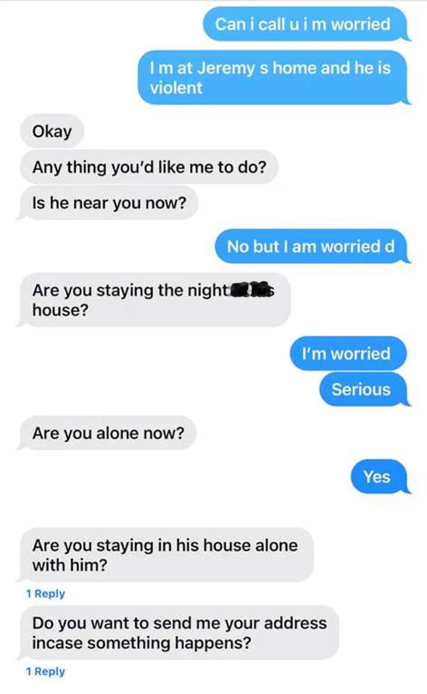 在与同事的短信中,她写道:“他疯了……我真的担心自己的安全。”
