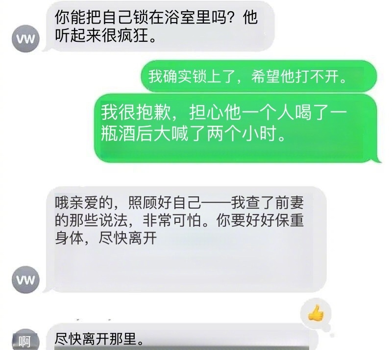 结果他一个人喝完了一整瓶红酒,突然情绪失控,怒吼了整整两小时。“我根本没反应,他越吼越凶。我太害怕了,只能把自己反锁在房间里,祈祷他晚上不会闯进来。”