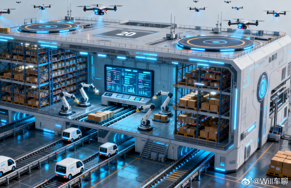 “上面起降无人机,下面是无人配送小车,里面直接由机器人装载货物。”