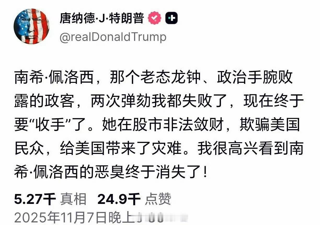 骂人还得是特朗普,他是真敢骂,真能骂。看到这篇贴文,假装“心疼”佩洛西一秒钟。一秒钟结束,我马上说,特朗普骂得好,佩洛西这老太婆太坏了,坏了美国还想霍霍中国,早该被收拾了,我见她到她的大红唇就心生厌恶。现在的佩洛西也不敢鼓吹自己是“股神”第二,因为她已经没有渠道获取那些内幕消息,也当不成某些利益团队的白手套,早该回去洗洗睡了。