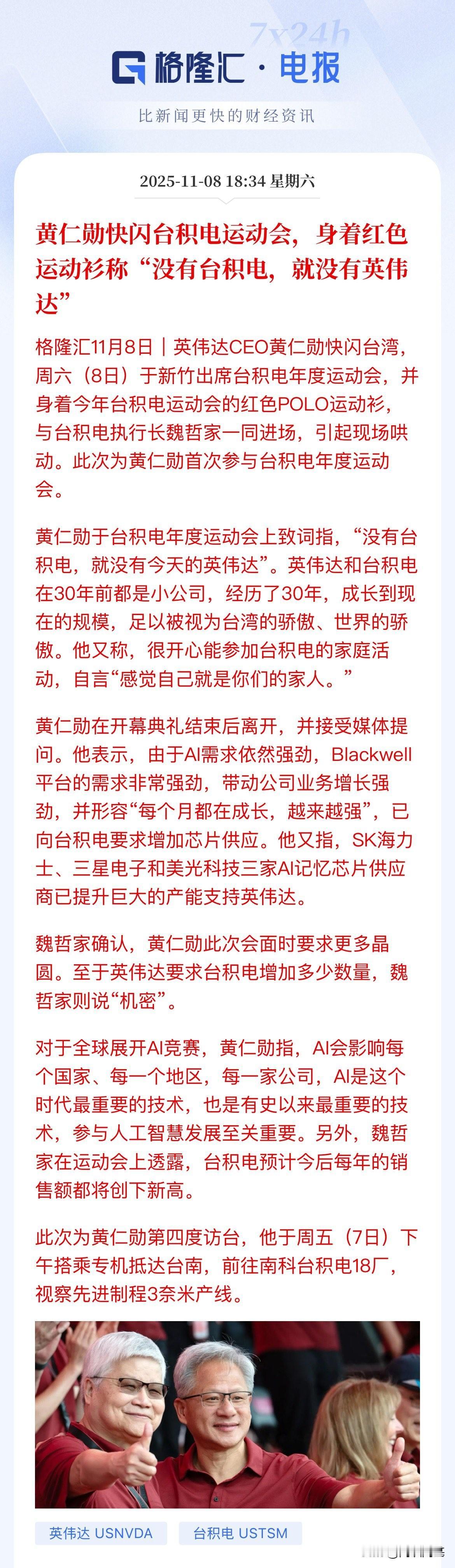 如果台湾回归了,台积电会真正属于我们自己的企业不,或许可能也得打个未知数,台湾势必回归我们,但台积电会吗,敌人会让我们称心如意吗 黄仁勋今天在我们台湾省参加台积电运动会表示,没有台积电,就没有现在的英伟达,这算是属于两个美国人的表演了。