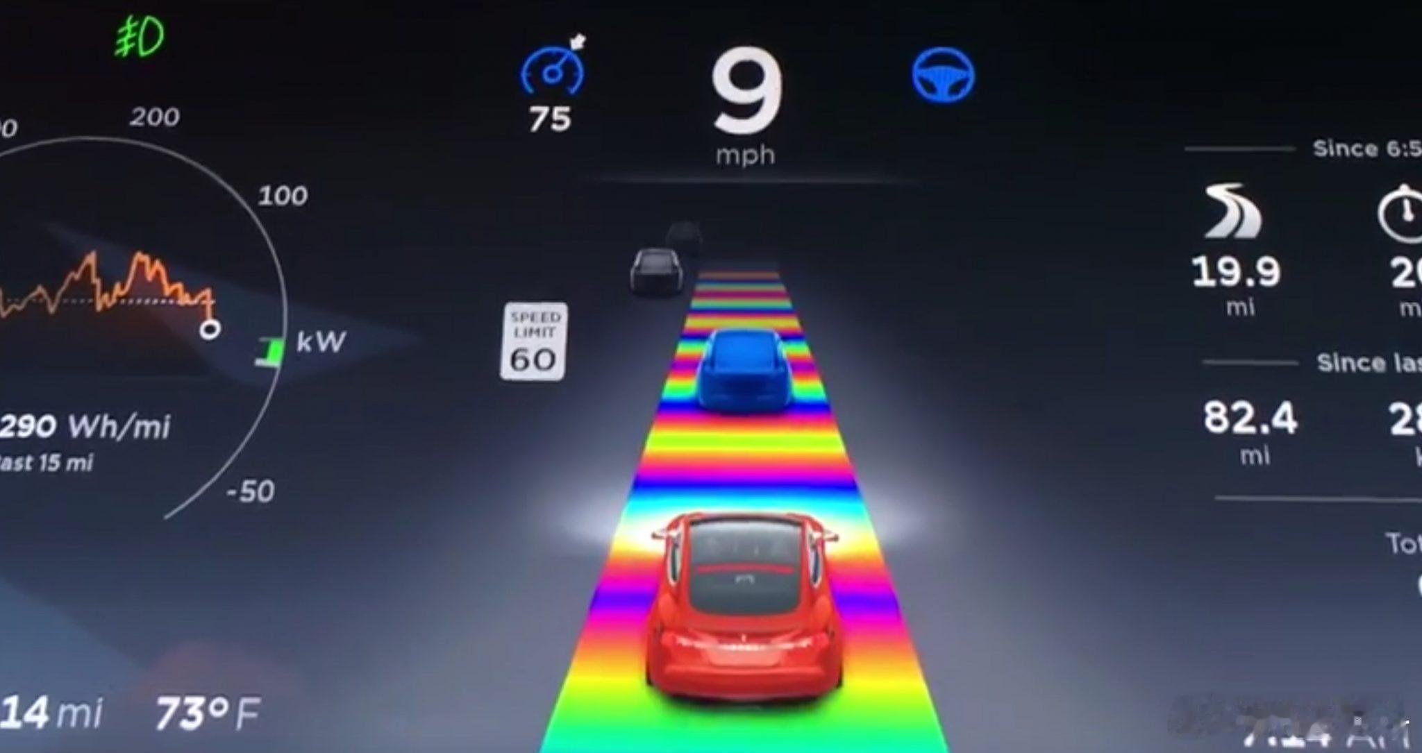 特斯拉在2016年进行了版本号为7.1.2.16.17的OTA,增加了自动辅助驾驶(AP)功能中的特效,就是现在熟知的“彩虹之路”。图1 为早期版本 图2 为现在版本