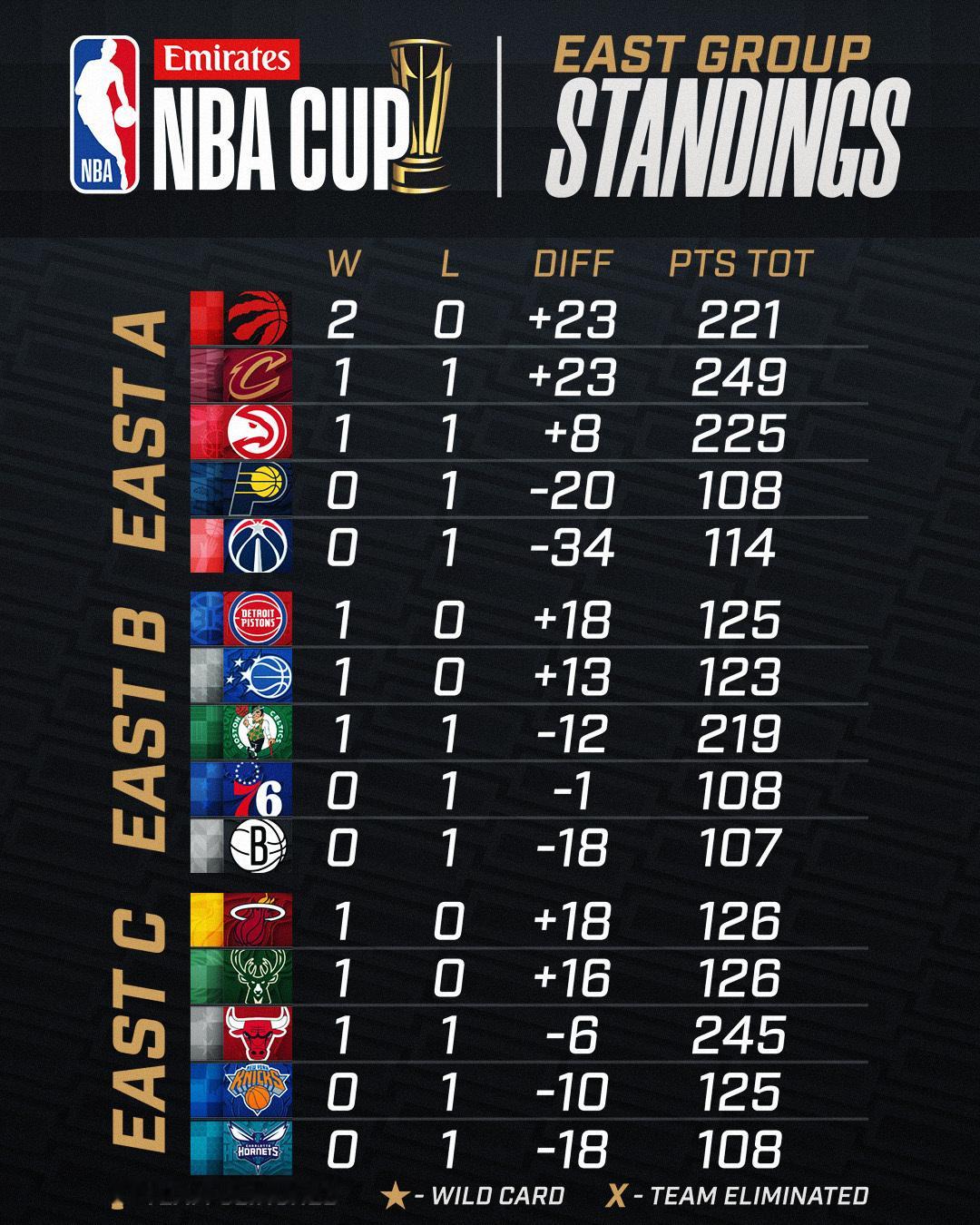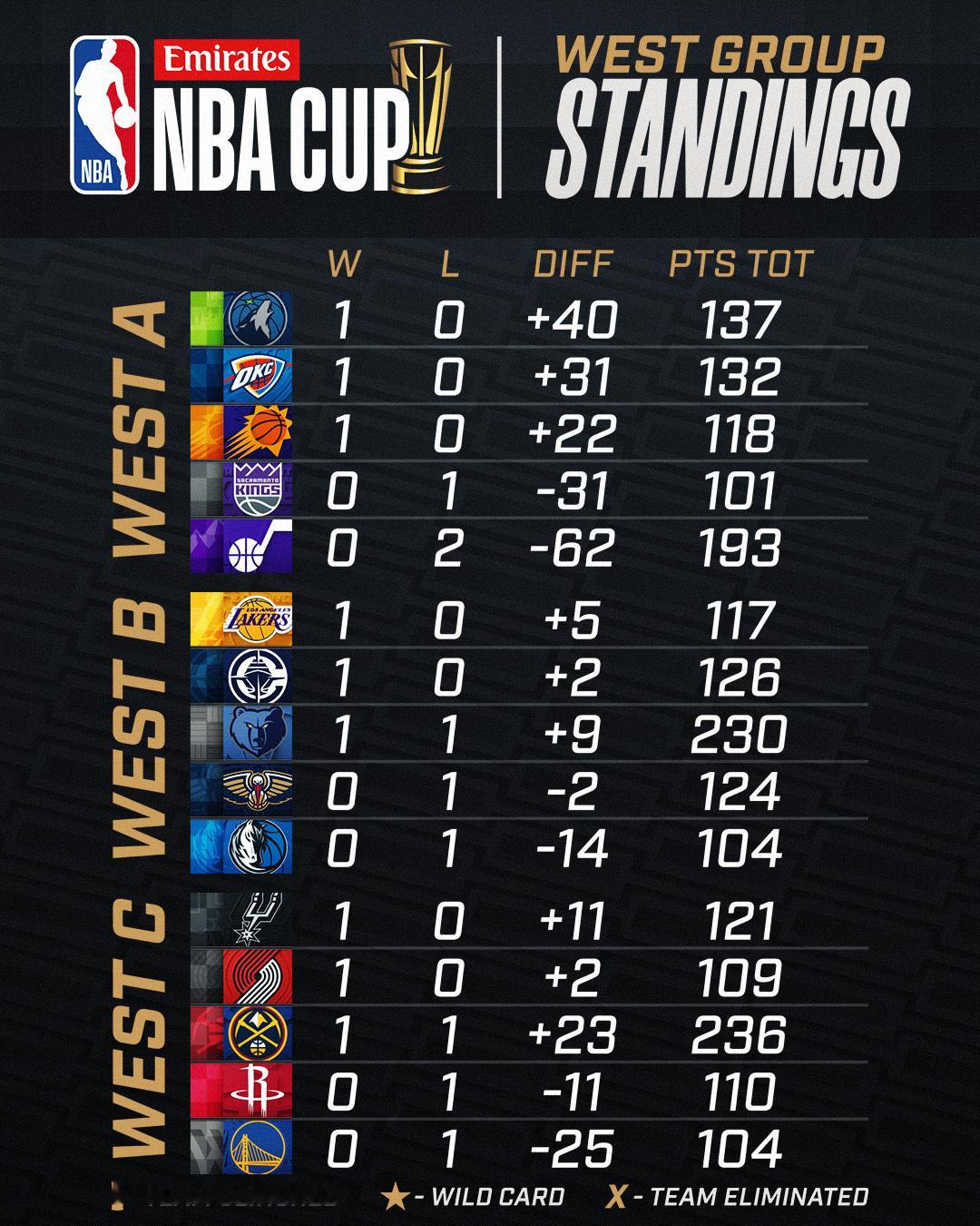 截止今天比赛结束后的NBA杯赛小组积分榜,湖人暂居西部B组第一。
