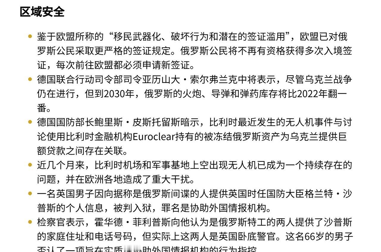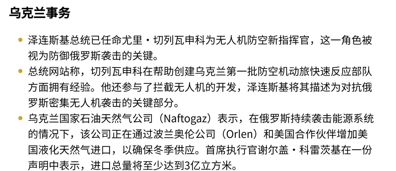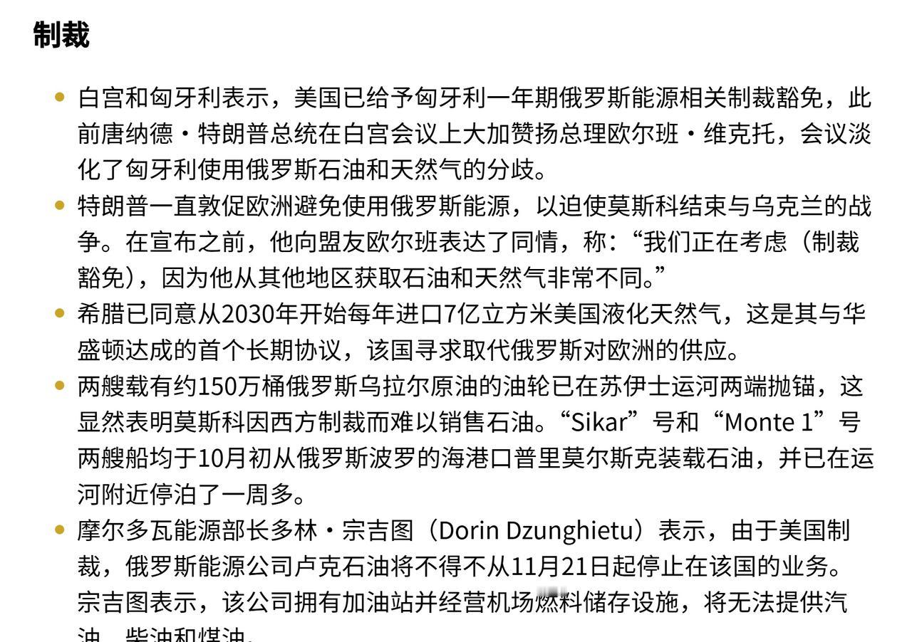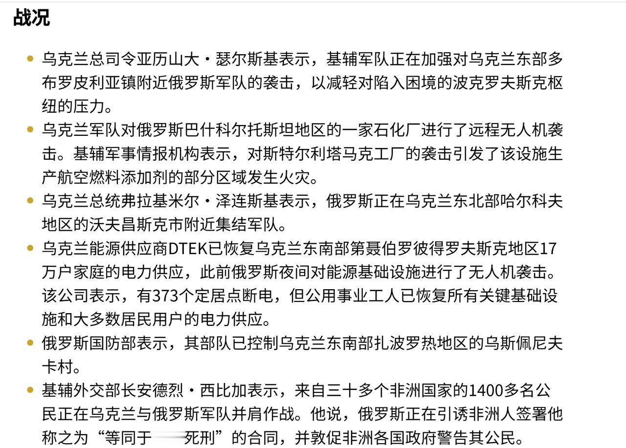 俄乌战争:第1353天关键事件: 战况 乌克兰总司令亚历山大·瑟尔斯基表示,基辅军队正在加强对乌克兰东部多布罗皮利亚镇附近俄罗斯军队的袭击,以减轻对陷入困境的波克罗夫斯克枢纽的压力。 乌克兰军队对俄罗斯巴什科尔托斯坦地区的一家石化厂进行了远程无人机袭击。基辅军事情报机构表示,对斯特尔利塔马克工厂的袭击引发了该设施生产航空燃料添加剂的部分区域发生火灾。 乌克兰总统弗拉基米尔·泽连斯基表示,俄罗斯正在乌克兰东北部哈尔科夫地区的沃夫昌斯克市附近集结军队。 乌克兰能源供应商DTEK已恢复乌克兰东南部第聂伯罗彼得罗夫斯克地区17万户家庭的电力供应,此前俄罗斯夜间对能源基础设施进行了无人机袭击。该公司表示,有373个定居点断电,但公用事业工人已恢复所有关键基础设施和大多数居民用户的电力供应。 俄罗斯国防部表示,其部队已控制乌克兰东南部扎波罗热地区的乌斯佩尼夫卡村。 基辅外交部长安德烈·西比加表示,来自三十多个非洲国家的1400多名公民正在乌克兰与俄罗斯军队并肩作战。他说,俄罗斯正在引诱非洲人签署他称之为“等同于……死刑”的合同,并敦促非洲各国政府警告其公民。 制裁 白宫和匈牙利表示,美国已给予匈牙利一年期俄罗斯能源相关制裁豁免,此前唐纳德·特朗普总统在白宫会议上大加赞扬总理欧尔班·维克托,会议淡化了匈牙利使用俄罗斯石油和天然气的分歧。 特朗普一直敦促欧洲避免使用俄罗斯能源,以迫使莫斯科结束与乌克兰的战争。在宣布之前,他向盟友欧尔班表达了同情,称:“我们正在考虑(制裁豁免),因为他从其他地区获取石油和天然气非常不同。” 希腊已同意从2030年开始每年进口7亿立方米美国液化天然气,这是其与华盛顿达成的首个长期协议,该国寻求取代俄罗斯对欧洲的供应。 两艘载有约150万桶俄罗斯乌拉尔原油的油轮已在苏伊士运河两端抛锚,这显然表明莫斯科因西方制裁而难以销售石油。“Sikar”号和“Monte 1”号两艘船均于10月初从俄罗斯波罗的海港口普里莫尔斯克装载石油,并已在运河附近停泊了一周多。 摩尔多瓦能源部长多林·宗吉图(Dorin Dzunghietu)表示,由于美国制裁,俄罗斯能源公司卢克石油将不得不从11月21日起停止在该国的业务。宗吉图表示,该公司拥有加油站并经营机场燃料储存设施,将无法提供汽油、柴油和煤油。 乌克兰事务 泽连斯基总统已任命尤里·切列瓦申科为无人机防空新指挥官,这一角色被视为防御俄罗斯袭击的关键。 总统网站称,切列瓦申科在帮助创建乌克兰第一批防空机动旅快速反应部队方面拥有经验。他还参与了拦截无人机的开发,泽连斯基将其描述为对抗俄罗斯密集无人机袭击的关键部分。 乌克兰国家石油天然气公司(Naftogaz)表示,在俄罗斯持续袭击能源系统的情况下,该公司正在通过波兰奥伦公司(Orlen)和美国合作伙伴增加美国液化天然气进口,以确保冬季供应。首席执行官谢尔盖·科雷茨基在一份声明中表示,进口总量将至少达到3亿立方米。 区域安全 鉴于欧盟所称的“移民武器化、破坏行为和潜在的签证滥用”,欧盟已对俄罗斯公民采取更严格的签证规定。俄罗斯公民将不再有资格获得多次入境签证,每次前往欧盟都必须申请新签证。 德国联合行动司令部司令亚历山大·索尔弗兰克中将表示,尽管乌克兰战争仍在进行,但到2030年,俄罗斯的火炮、导弹和弹药库存将比2022年翻一番。 德国国防部长鲍里斯·皮斯托留斯暗示,比利时最近发生的无人机事件与讨论使用比利时金融机构Euroclear持有的被冻结俄罗斯资产为乌克兰提供巨额贷款之间存在关联。 近几个月来,比利时机场和军事基地上空出现无人机已成为一个持续存在的问题,并在欧洲各地造成了重大干扰。 一名英国男子因向据称是俄罗斯间谍的人提供英国时任国防大臣格兰特·沙普斯的个人信息,被判入狱,罪名是协助外国情报机构。 检察官表示,霍华德·菲利普斯向他认为是俄罗斯特工的两人提供了沙普斯的家庭住址和电话号码,但实际上这两人是英国卧底警官。这名66岁的男子否认了一项旨在实质性协助外国情报机构的行为指控。 俄罗斯事务 一名律师称,他的当事人在公交车上浏览互联网时偶然发现了有关亲乌克兰作战部队的信息,他是第一个已知因一项禁止在线搜索莫斯科认为“极端主义”材料的新法律而受到调查的俄罗斯人。 俄罗斯媒体援引乌拉尔地区斯维尔德洛夫斯克州律师谢尔盖·巴尔苏科夫的话说,他正在代表20岁的谢尔盖·格卢希赫,格卢希赫因查看俄罗斯视为恐怖分子的部队信息而被其互联网服务提供商举报给联邦安全局。 半岛电视台+通讯社