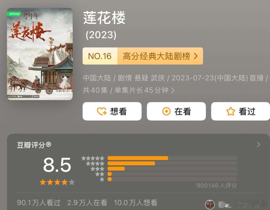 成毅莲花楼打分人数超90万 成毅《莲花楼》豆瓣打分人数已经超90万了,超级长尾恐怖如斯![么么哒]