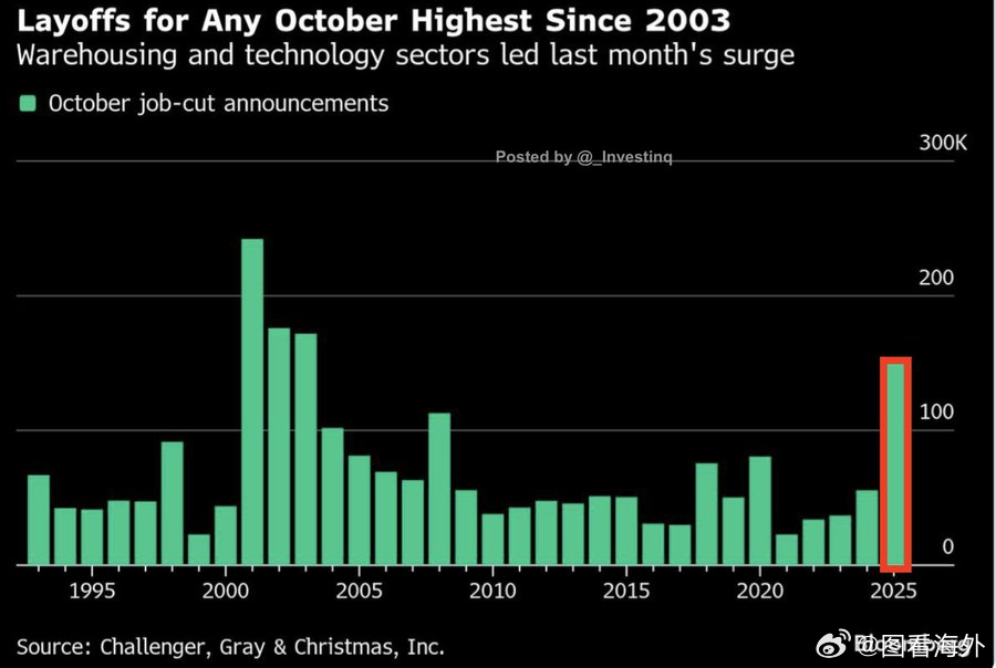 据Challenger报告,2025年10月美国裁员达15.3万人,为2003年以来最严重的单月裁员,同比激增175%。截至10月底,今年累计裁员已超110万人,较去年同期大增65%。