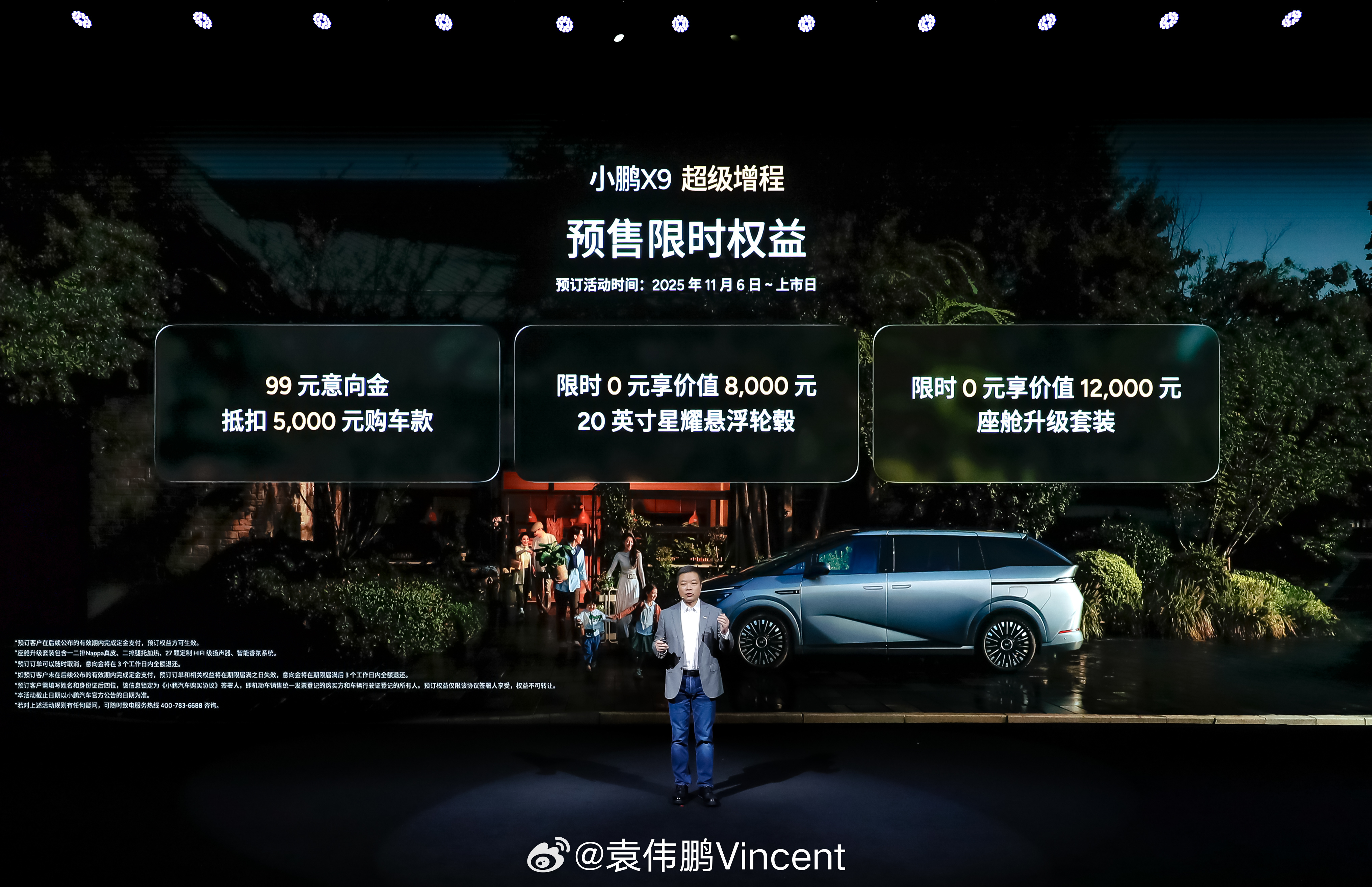 限时尊享权益:2025年11月6日-上市日,预订用户均可享受99元意向金抵扣5000元购车款;同时限时0元享价值8000元的20英寸星耀悬浮轮毂和价值12000元的座舱升级套装,小鹏X9老车主专享置换权益10000元,感谢每一位鹏友的信任与选择。