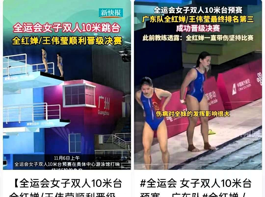 这下好了, 不仅教练陈若琳惊呆了, 全网的粉丝也惊呆了, 全红婵胫骨踝关节带伤作战,身上贴满肌贴,每一次跳跃都可能伴随着剧痛,可她硬是在27组选手中杀出重围,以第三名的成绩稳稳晋级决赛! 谁都知道她每天疼得难受,训练和比赛都要咬牙坚持,可赛场上的她从未露怯,五轮动作一轮比一轮稳健,最后一轮5253B更是完美发挥,直接斩获75.84分的高分! 这是她本届全运会的收官之战,此前已和王伟莹拿下团体金牌的她,本可以稍作休整,却选择带着伤痛继续冲刺,这份执着和毅力让人动容。 粉丝们看着她站上跳台的身影,既揪心又骄傲。所谓天才,从来都不是一帆风顺,而是在伤痛面前依旧挺直腰杆,在压力之下依旧拼尽全力的倔强。 全红婵的魅力,早已超越了金牌本身。她让我们看到,年轻一代的运动员不仅有天赋,更有不服输的韧劲和为国争光的责任感。这份精神,比任何荣誉都更能打动人心。 赛场上的每一次跳跃,都是她与伤痛的对抗,都是对梦想的坚守。这个拼尽全力的小姑娘,值得所有的掌声和喝彩。