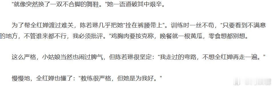 “就像突然换了一双不合脚的舞鞋,每个动作都要重新找平衡。 ”教练陈若琳透露,为备战全运会,她进行了严格的体重控制,每日多次测量体重,饮食和训练都精确到克,同时坚持康复训练和动作打磨。