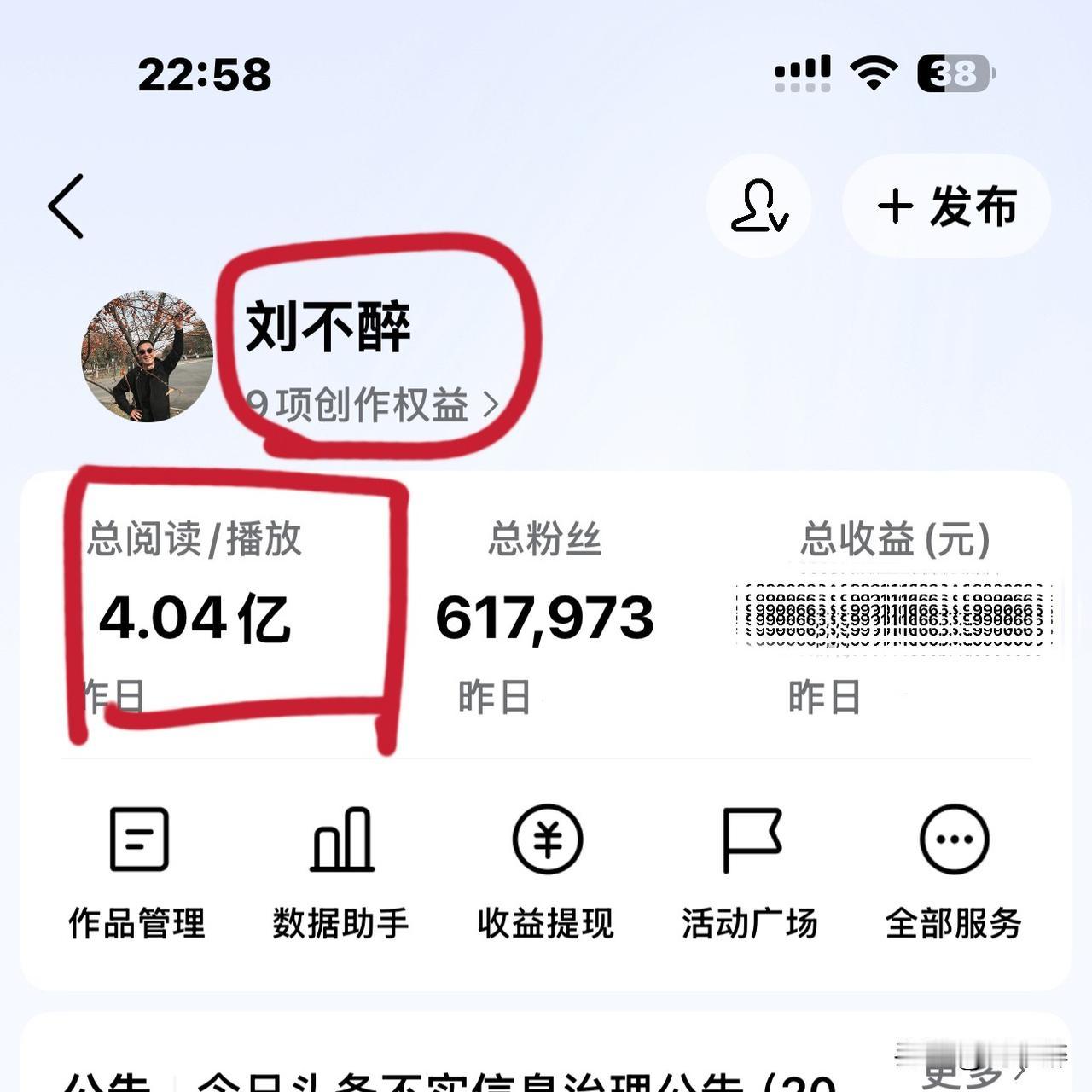 今天,我的头条阅读量冲破4.04亿! 当头条主页弹出4.04亿这个数字的刹那,我简直不敢相信自己的眼睛。 4.04亿,这意味着全国约三分之一的人都读过我的作品。 对于我这样的业余创作者来说,这是多么大的荣耀与骄傲! 取得这样的成绩,不只是我个人努力的结果,更要归功于平台的青睐,还有广大读者的厚爱与支持。 大恩不言谢,唯有不断创新、突破自我,才能不辜负所有人对我的期待。 关注@刘不醉 ,幸福天天享!