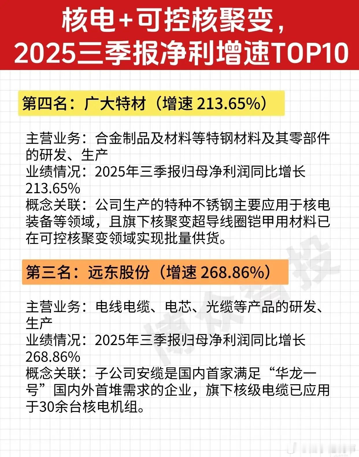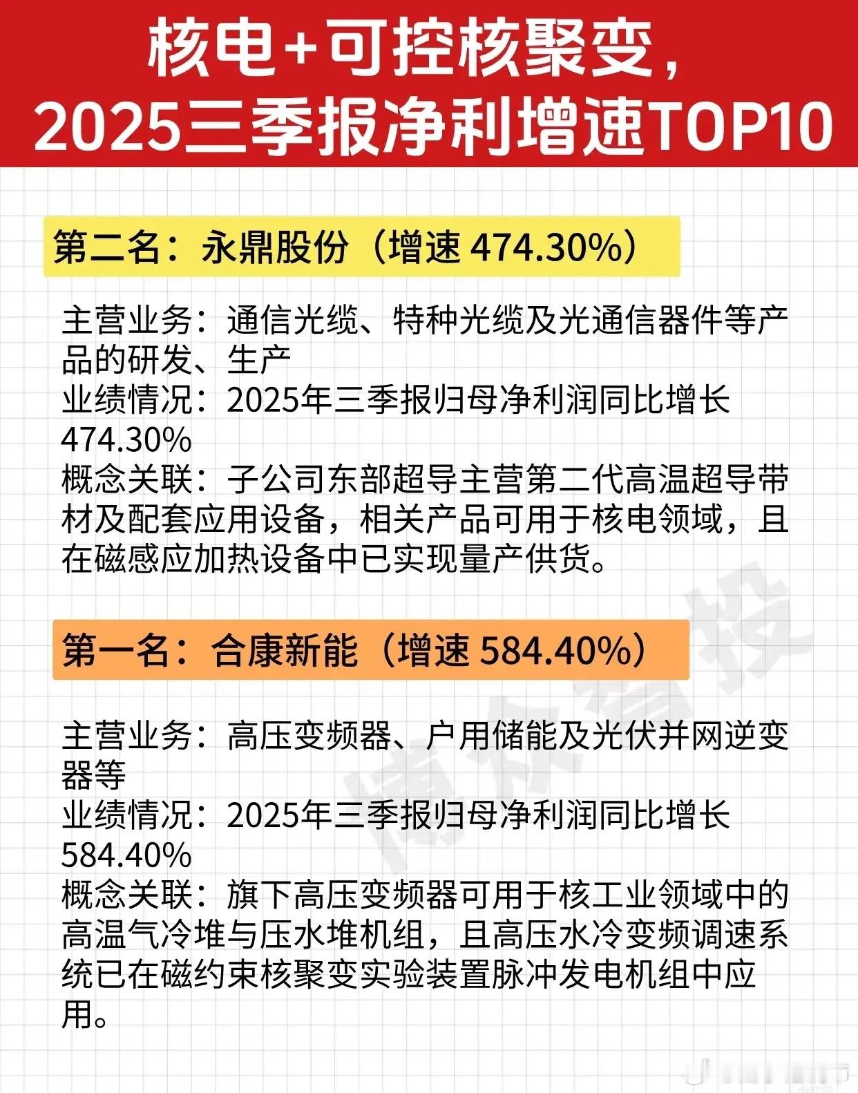 🏆 核电 + 可控核聚变,2025三季报净利增速TOP10 企业汇总