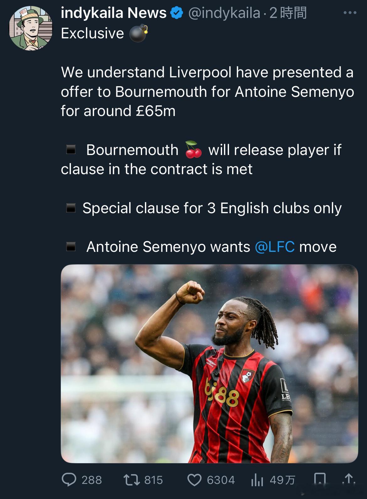 而相对来说,绿帽的措辞是比较确定的,而利物浦对于赛梅约的兴趣也是可以通过绿帽以外的可信度较高的媒体佐证的。