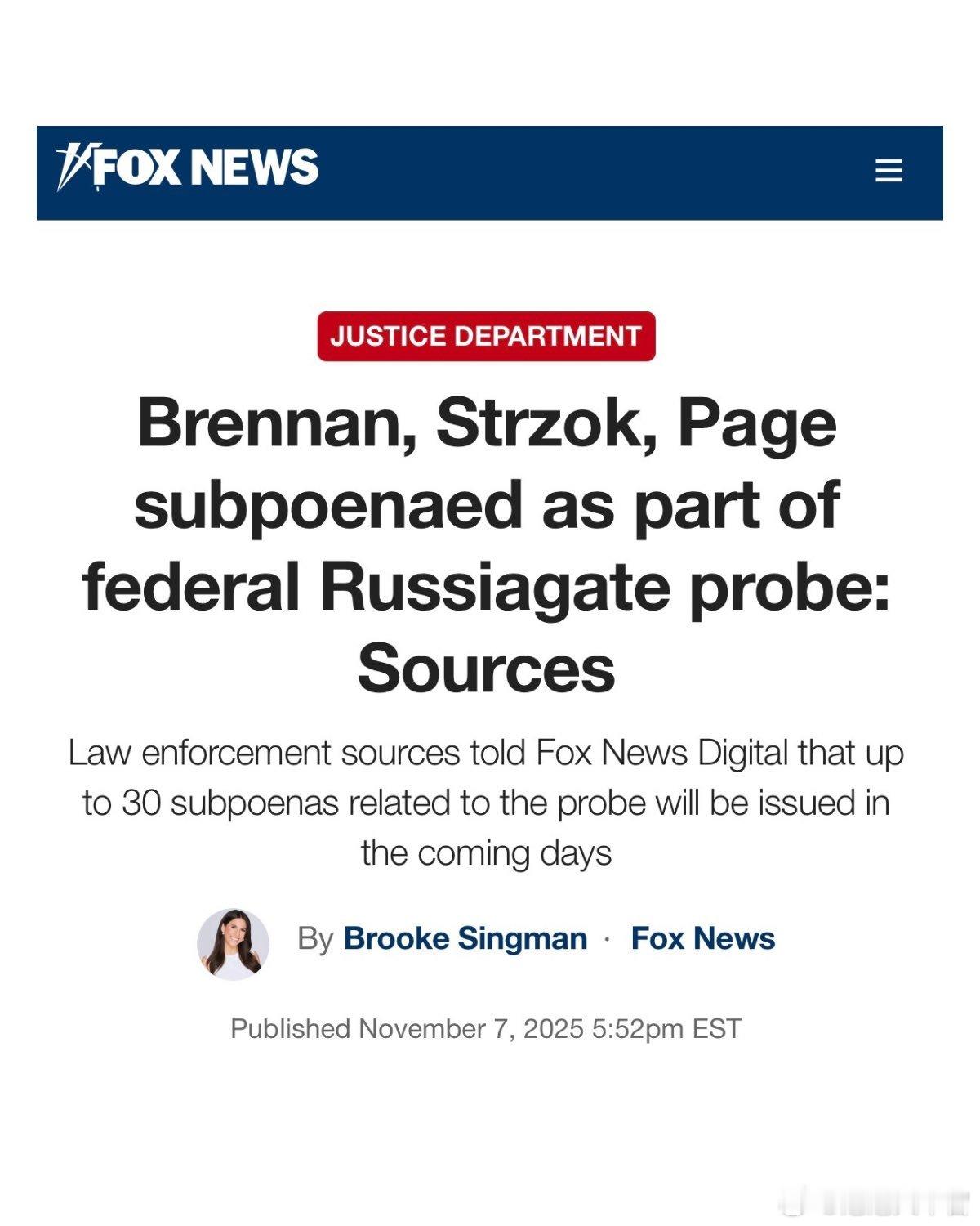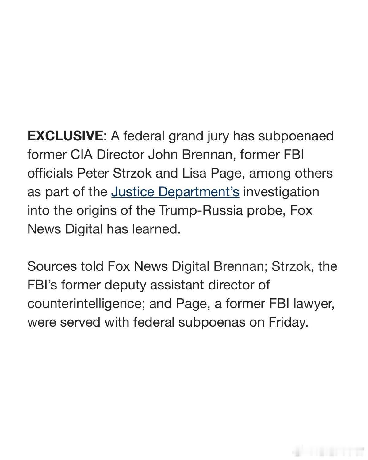 突发新闻:联邦大陪审团传唤了前中央情报局局长约翰·布伦南、前联邦调查局官员彼得·斯特佐克和丽莎·佩奇,以及司法部对俄罗斯门骗局的调查设计的其他人。。