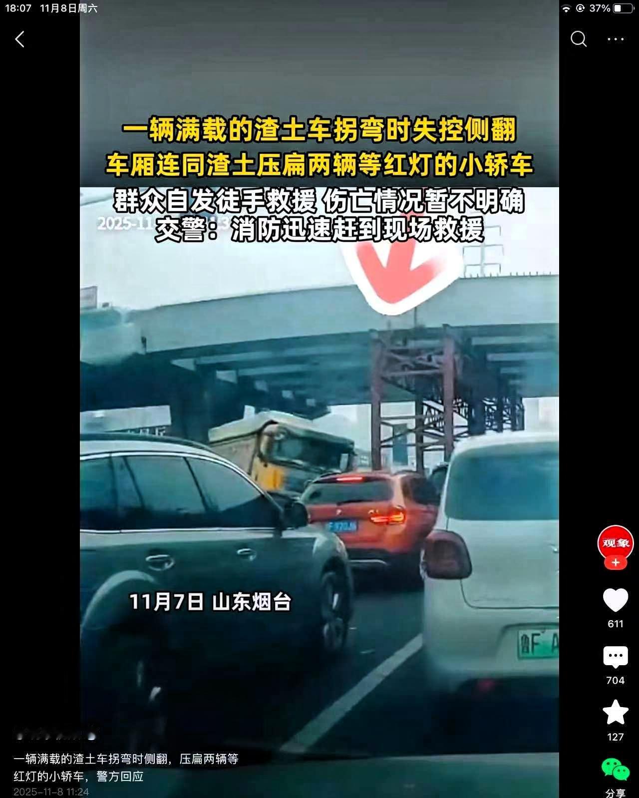 一死一伤,已经通报了!烟台电厂附近这个渣土车拐弯失控埋了两辆车。 官方通报已经明确:渣土车拐弯失控,车上的土块石块瞬间倾泻,直接把两辆正常行驶的小车埋了个严实。监控里的画面看得人心脏骤停——小红宝马车主明显察觉到危险,车身动了动想冲出车道,可不知是犹豫了、还是被周边车辆挡住没来得及,最终停在了原地。 就是这短短一秒的迟疑,彻底改写了结局。冲出去或许是追尾,可至少有生还的可能;没冲出去,就被几十吨的渣土死死压住,再也没了动静。后面车上的人万幸被路过的热心市民及时拉出,捡回一条命,可小红宝马的车主,却永远留在了这场本可避免的悲剧里。 真的忍不住质问渣土车司机:开那么快到底图什么?你方向盘里攥着的是别人的身家性命啊!就算保险买得再多,能换回逝去的生命吗?能抚平家属撕心裂肺的伤痛吗?夜里想起这场惨剧,你的良心能安吗? 这根本不是意外,而是“漠视安全、心存侥幸”的必然!很多大车司机总觉得“艺高人胆大”,把超速当效率,把别人的安全当儿戏,却忘了大车的盲区和惯性有多可怕,一旦出事就是毁灭性的后果。 马路上没有后悔药,每一次疏忽、每一次侥幸,都可能酿成天人永隔的悲剧。不管是大车还是小车,上路行驶的第一准则永远是“安全”。大车司机多一份敬畏,少一份急躁;普通车主多一份警惕,远离大车盲区,才能让这样的悲剧少一点、再少一点。