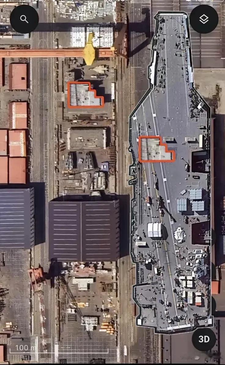 这就解释得通南北同时开建的内涵了:①南边是003G型,改进了舰岛与烟道的矛盾,避免了在开足马力时熏黑天线阵列的问题。从图①②看,甲板分布结构与003(图③)无异,双电梯布局,舰岛右侧居中。也就是说,老四19号舰是福建号的孪生姐妹,不是004型!就让给江苏吧[呲牙][呲牙] ②北边是004型核动大平板,从合拢的尺寸推测与福特号接近(图⑨)!舰岛后移,甲板面积大增,解决了003甲板上的小问题。舰岛的构型与水泥航母舰岛除去后面的烟道部分后的形状一致(图8)!也就是说老五20号舰才是004型,就免为其难地给广东吧?[捂脸][捂脸] ③由上两条知道,水泥舰母主要是验证004型的构造。而舰岛是同时验证004的与003G的!004舰岛加上后面的烟道组合就成了003G的舰岛(图⑧)! 完美!