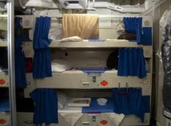 睡的是三层铺,但人家这床铺是恒温的,26度,睡着绝对舒适。美国航母也是这个标准,但我估计,他们的床铺可没恒温的条件。有人说,之所以三层铺,是因为现在的航母还不够大。 自动化程度高,需要的人就少,居住环境就越舒服,几十万吨的集装箱轮油轮,全船就30人不到,人人都是单间,四大头都是套间。 就算再大,普通水兵也不可能有单间的,最多双层床就顶天了,因为航母上人实在太多了。 应该给航母舰再配一艘保姆船。休假的时候可以在保姆船上休息。