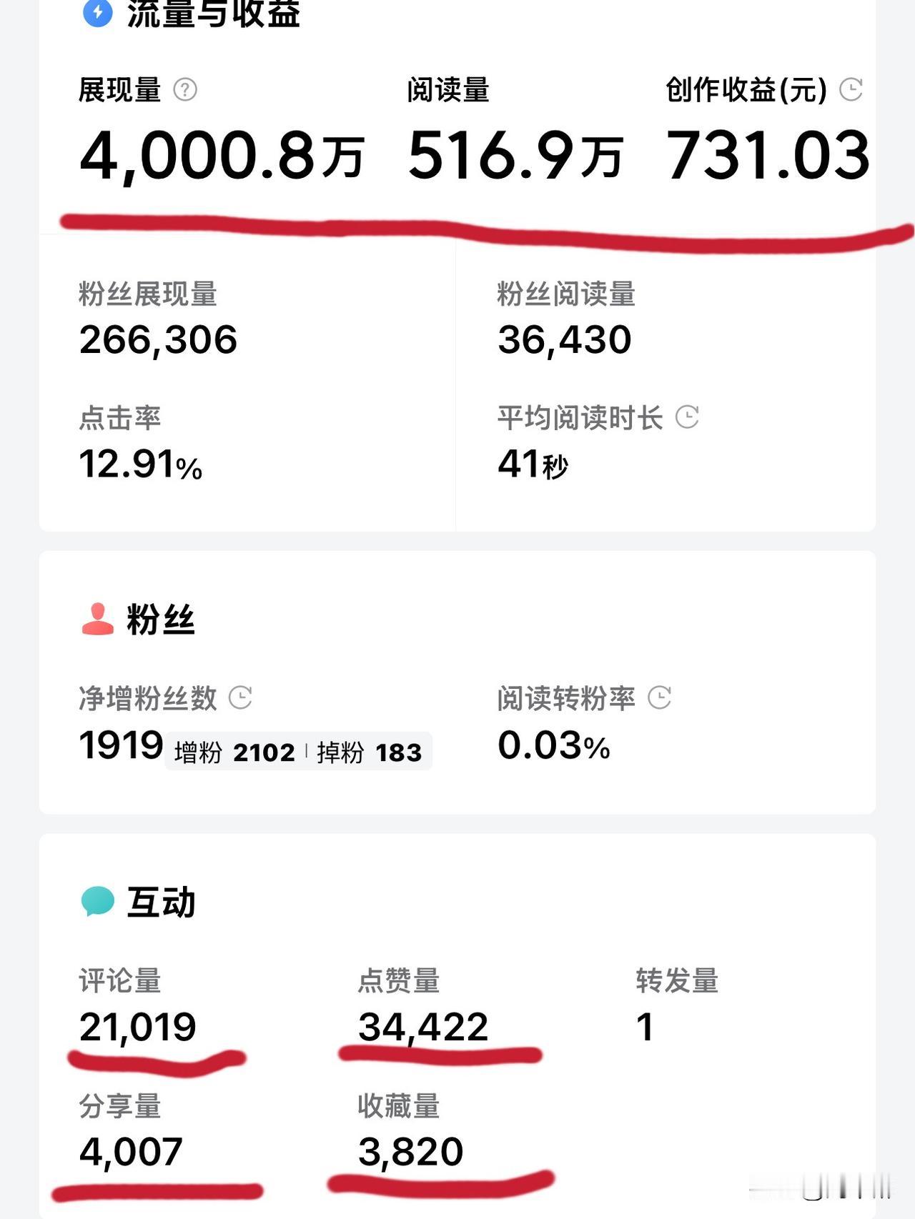 爆款,流量未必高! 我有一个作品 展现量高达4000.8万 阅读量达516.9万 评论量为2.1019万 点赞量是3.4422万 分享量有4007 收藏量为3820 流量收益仅731.03元 谁能告诉我,平台是如何计算流量的呢? 谢谢🙏