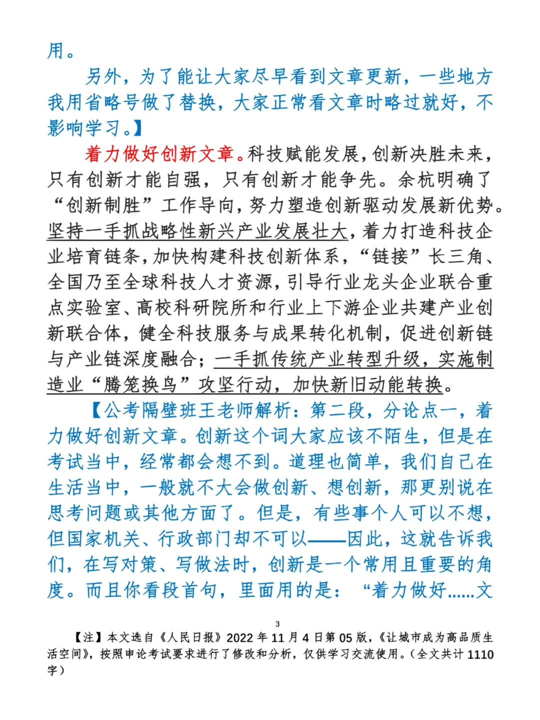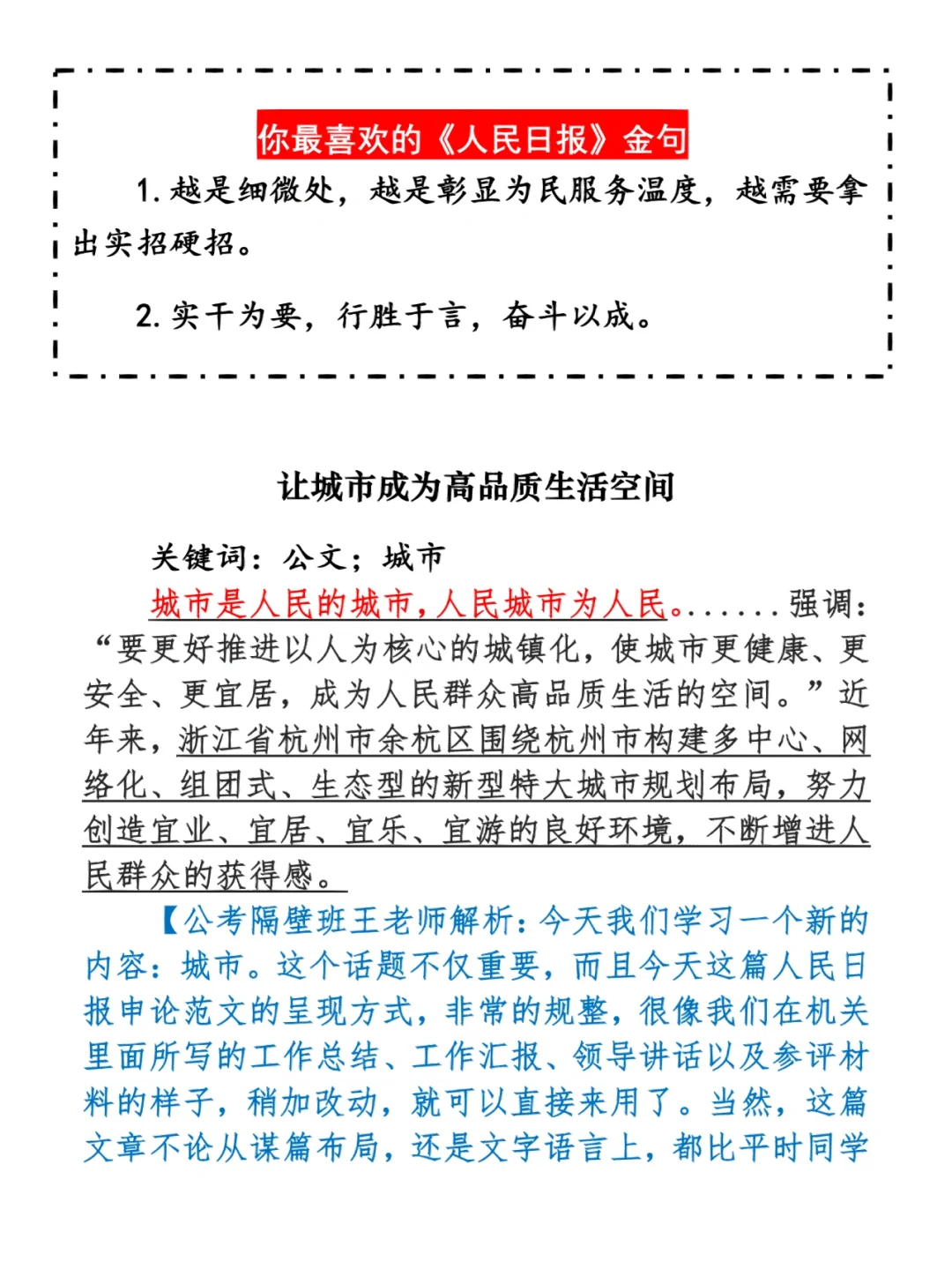 如何抄写:每天的抄写文章以图片形式发在“公考隔壁班王老师”账号,红色字是重点句和结构句,黑色字是正文,蓝色字是解析,大家抄写时不必抄蓝色字。建议先通读全文(包括蓝色解析部分),做到心中有数再开始抄写,效果会更好。