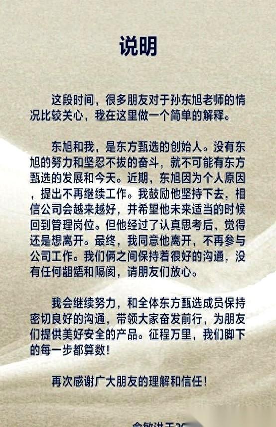 孙东旭,还是走了。 老俞发了个视频,说小孙是个人原因离开,俩人好着呢,没任何龃龉。 这话说的,就好像一对情侣分手,非要跟全世界宣布“我们是和平分开,依然是最好的朋友”。你信吗?反正我是半信半疑。 还记得去年冬天那场“小作文”风波吗? 那就是根刺。 一个CEO,在直播间里当着几万人的面,几乎是摔着手机,带着情绪怼网友。那股子“我才是老板,你们懂个屁”的劲儿,隔着屏幕都溢出来了。 太年轻了。 或者说,太顺了。没挨过社会的毒打,不知道“水能载舟,亦能覆舟”这句话,在互联网时代有多么恐怖。 老俞是什么人?从泥地里摸爬滚打出来的。他太懂了。 他知道,当一个叫董宇辉的“兵”,已经能影响整个战局的时候,你这个“将”如果还拎不清,那就只能换掉你。 保兵,还是保将? 这根本不是一道选择题。这是一道生存题。 所以,先是免去CEO,让他“休个长假”。 说白了,就是给彼此一个台阶,降降温,看看这事儿能不能过去。 现在看来,过不去了。心里的那道坎,终究是没迈过去。 成年人的世界,哪有那么多轰轰烈烈的决裂。 多的都是这种,说着“个人原因”,留着“体面”,然后悄无声息地淡出。 江湖路远,各自珍重吧。 东方甄选这艘船,还得往前开。只是船上,少了一个曾经用尽全力的掌舵人。