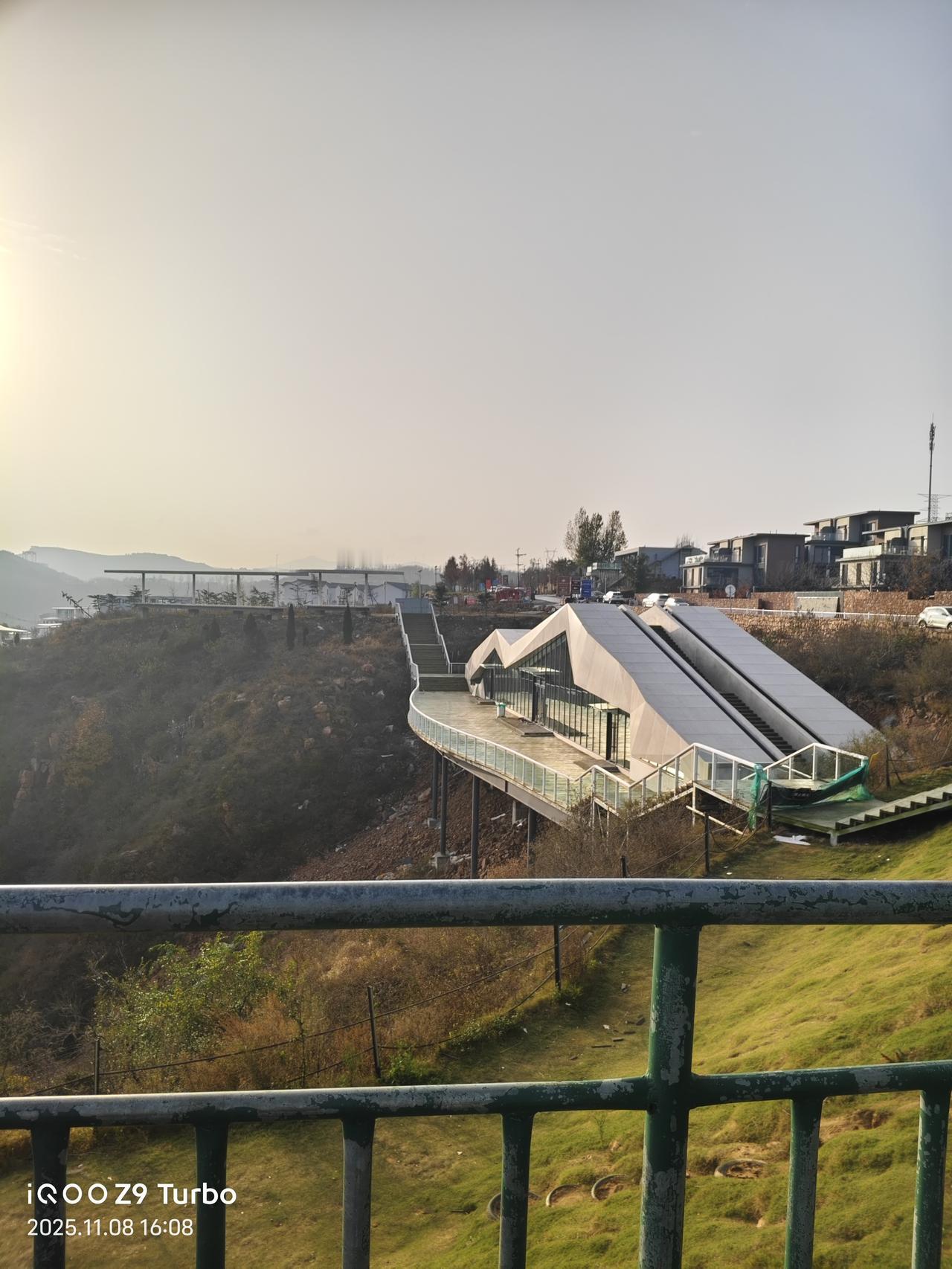 傍晚来这地儿逛,感觉太绝了!山坡上那建筑造型跟科幻片里的似的,折线屋顶贼有设计感。远处山峦晕在暮色里,近处草地还透着点绿,旁边错落的房子也挺有格调。吹着风,看着这景,一天的疲惫都被治愈了,这地方太适合散心啦~