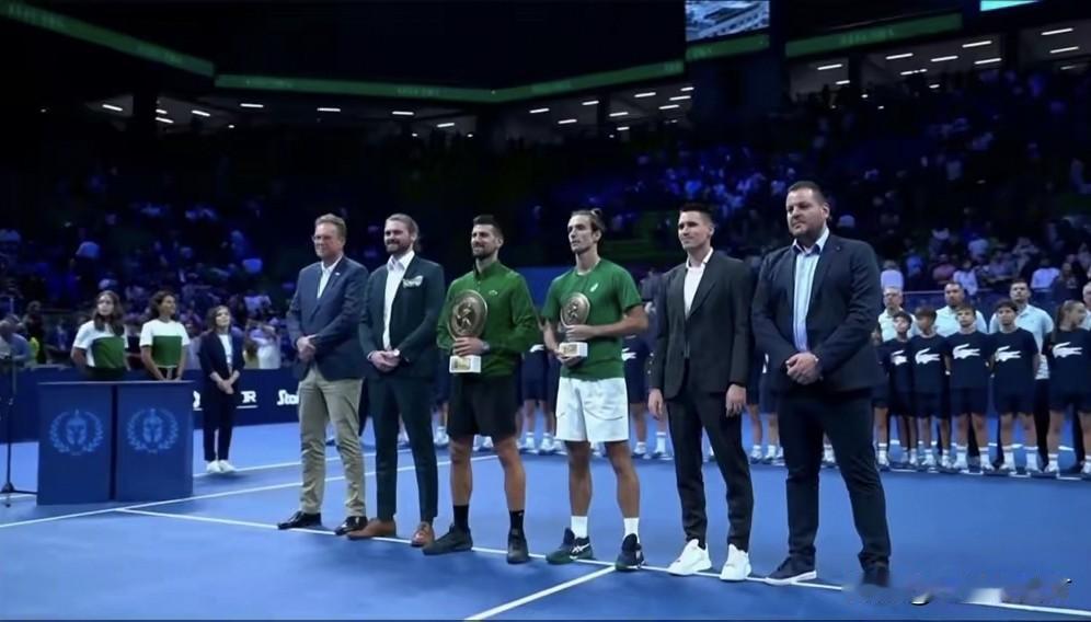ATP250雅典公开赛男单决赛,已经举家移居希腊的德约科维奇“主场”作战,经过2小时58分钟的三盘鏖战,以4-6、6-3、7-5逆转击败洛伦佐·穆塞蒂夺冠,取得室内硬地赛的第202场胜利,高居历史第一,继日内瓦站后,拿到本赛季第二冠,也是职业生涯第101个冠军,连续20年都有单打冠军入账,位列历史第一,冠军总数男子网坛排名历史第三,距费德勒只差2冠,而其中在硬地赛场收获了72个冠军,独霸公开赛年代男子历史第一,同时,这个冠军也让38岁零5个月的德约成为自1977年以来赢得该项赛事冠军最年长的球员。 而只有夺冠才能拿到最后一个总决赛席位的穆塞蒂,没能如愿,最后一个席位最终归属于加拿大的阿利亚西姆。不过,德约夺冠后很快宣布自己因为肩伤退出年终总决赛,这样,在赛场上被德约击败挡在总决赛门外穆塞蒂,又被德约“让”了进来,让他经历了“冰火两重天”,他将首次亮相总决赛舞台,顶替德约进入吉米·康纳斯组,与阿尔卡拉斯、弗里茨和德米纳尔争夺同组竞技。
