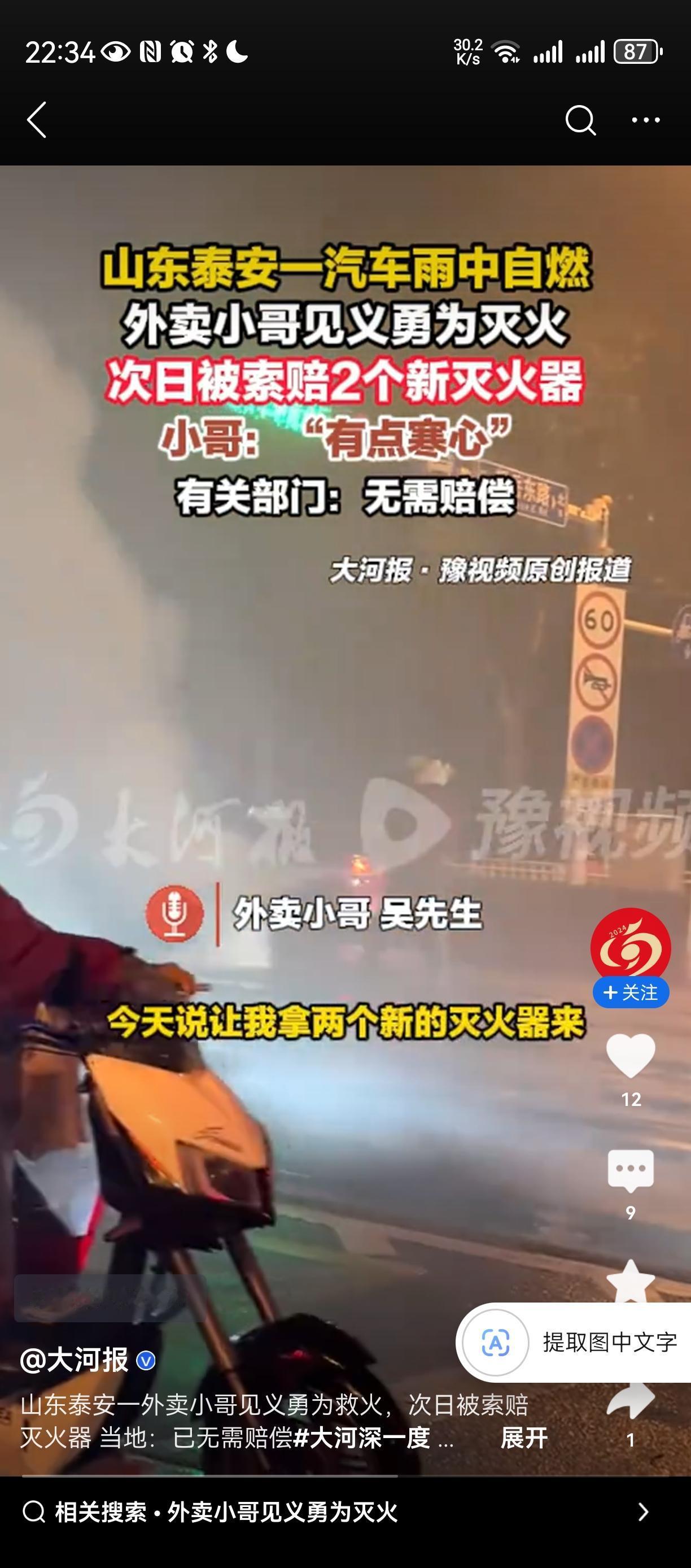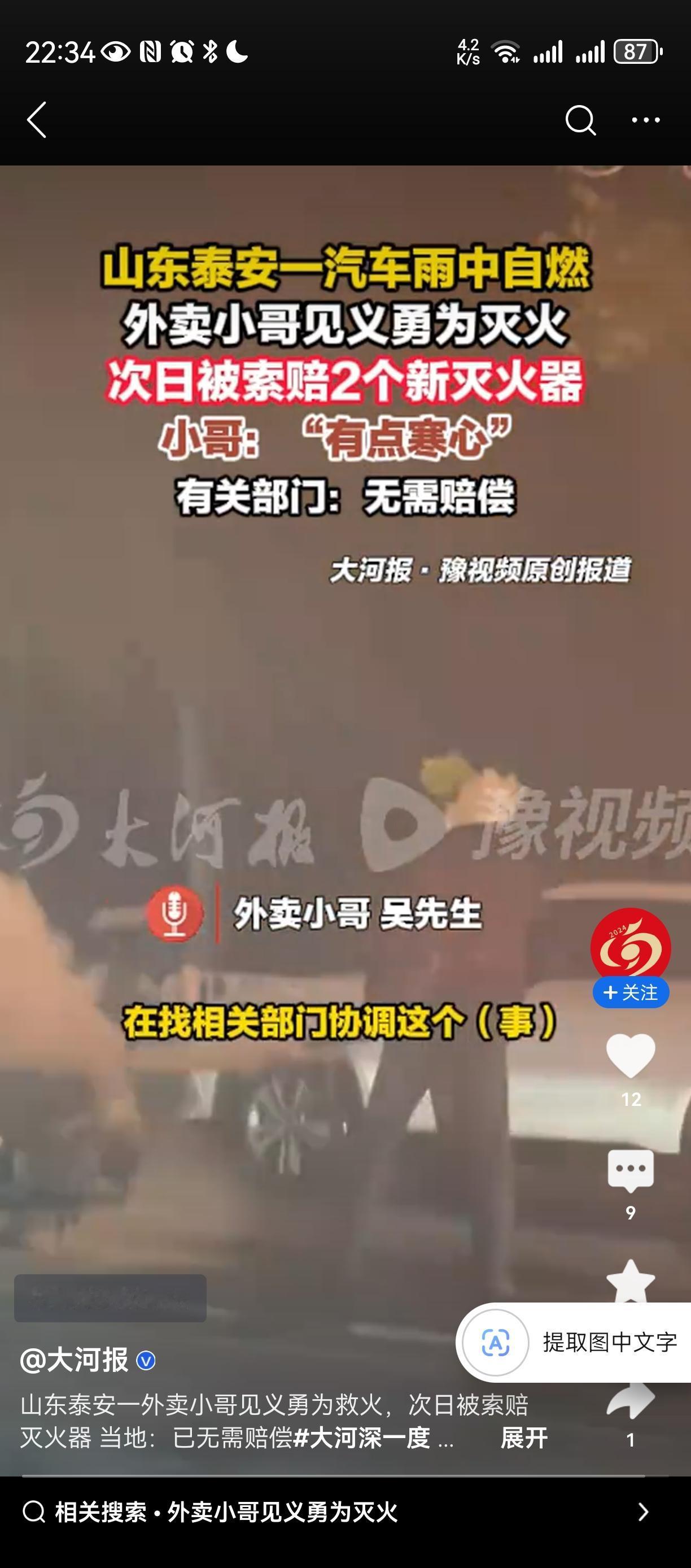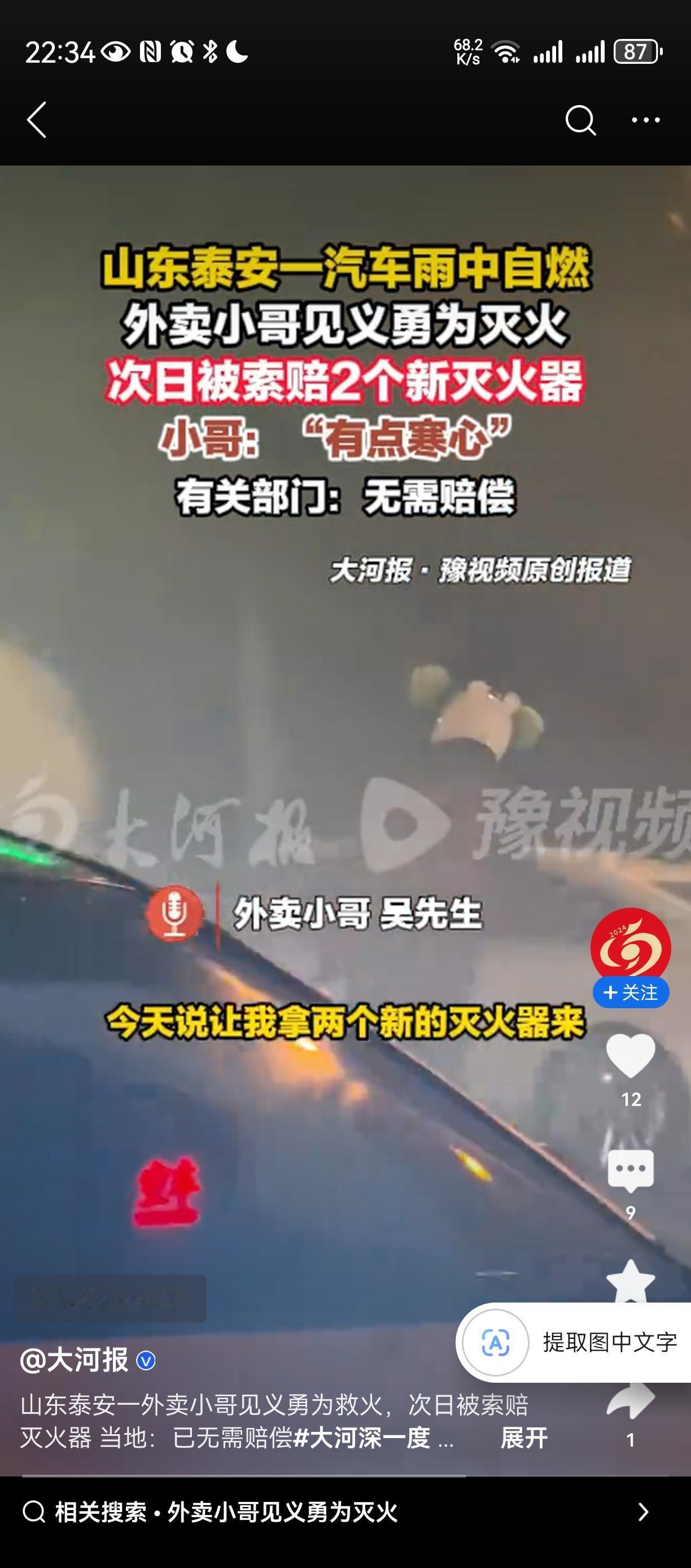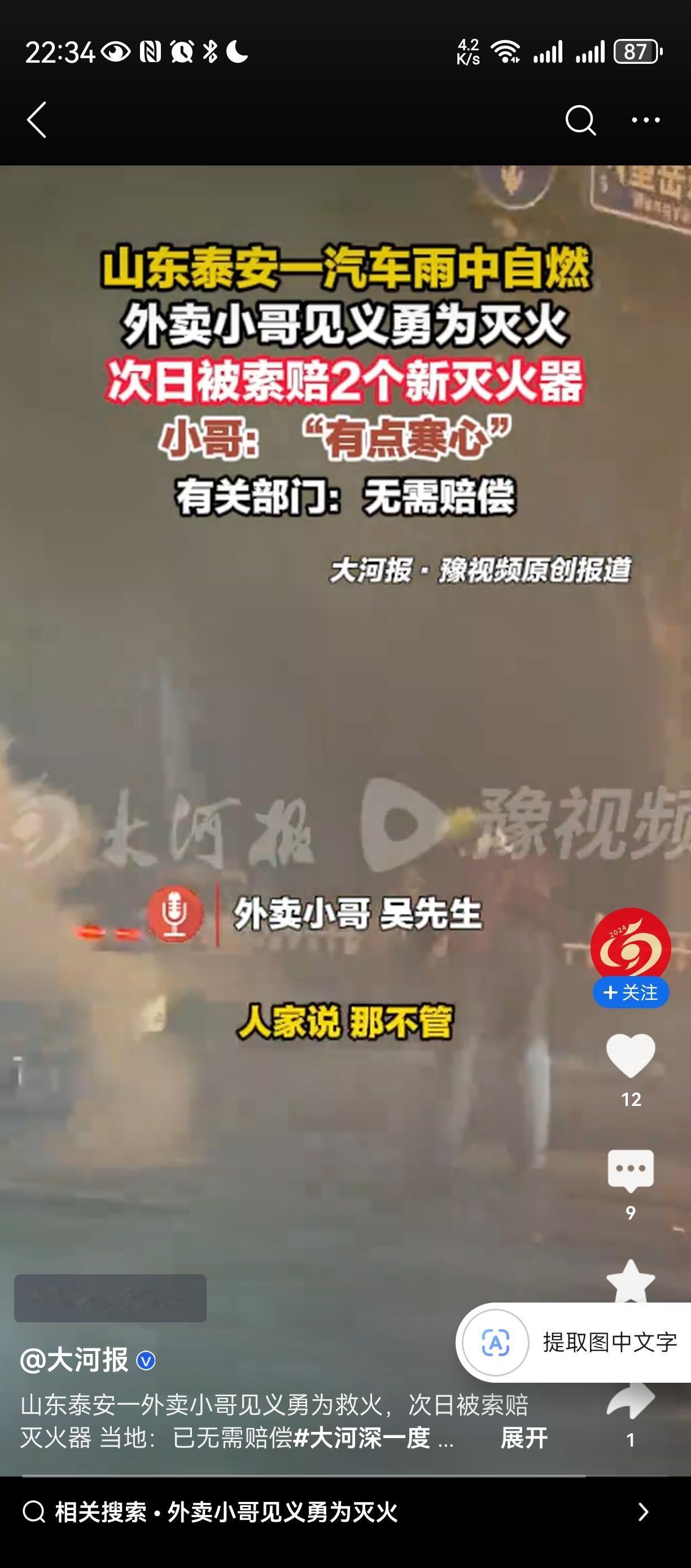 给外卖小哥点赞 宁愿自己不吃饭, 耽误一天的单子, 甚至已经超时了。 仍然决定用灭火器灭火, 把风险降到了最低状况。 外卖小哥 然而但是, 居然要他赔偿灭火器🧯? 什么骚操作???