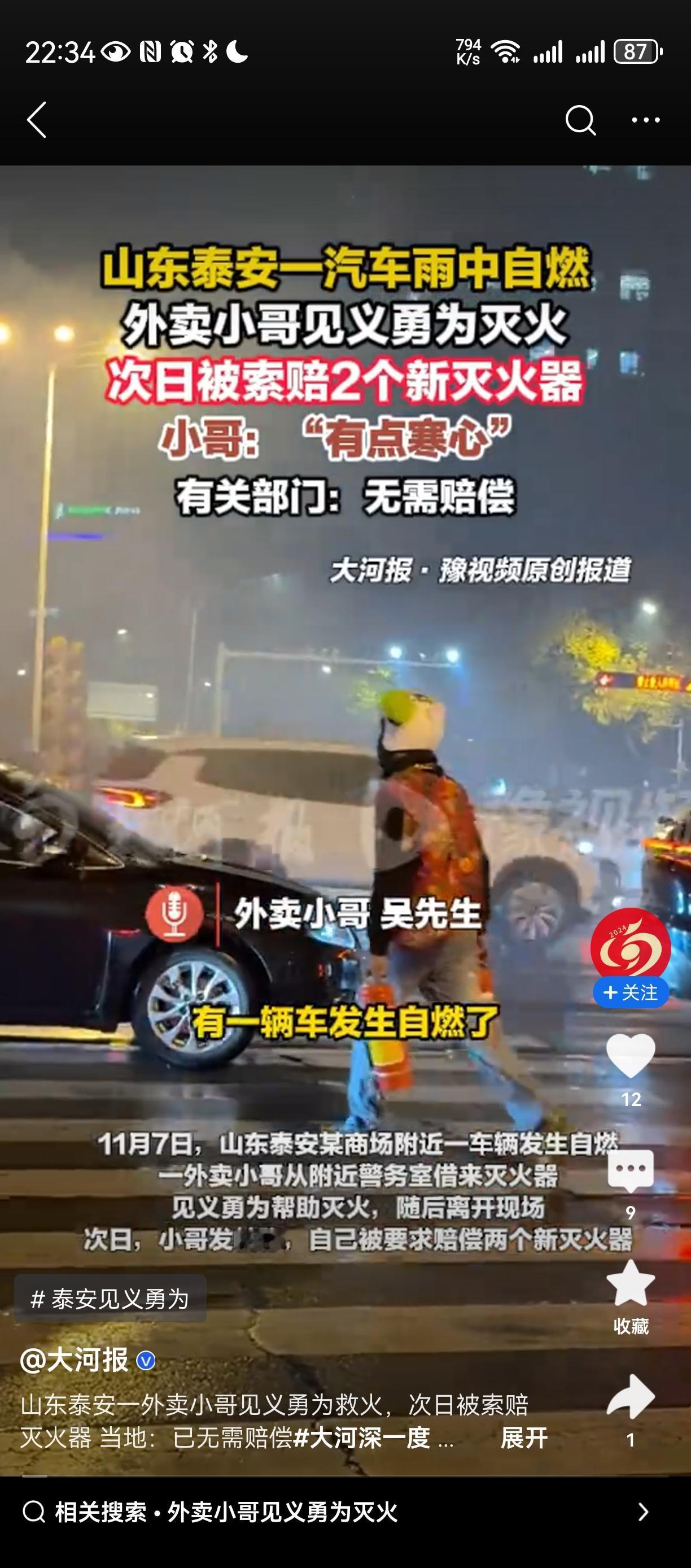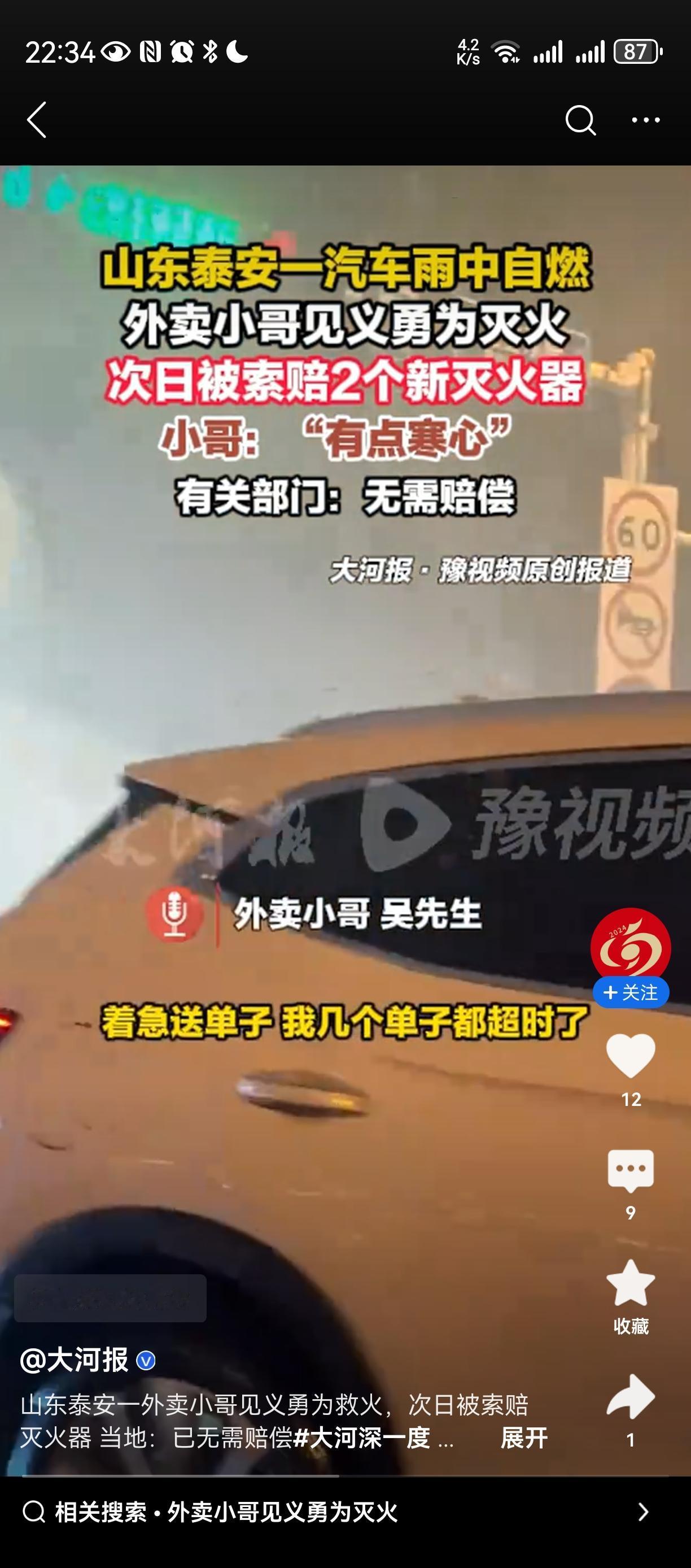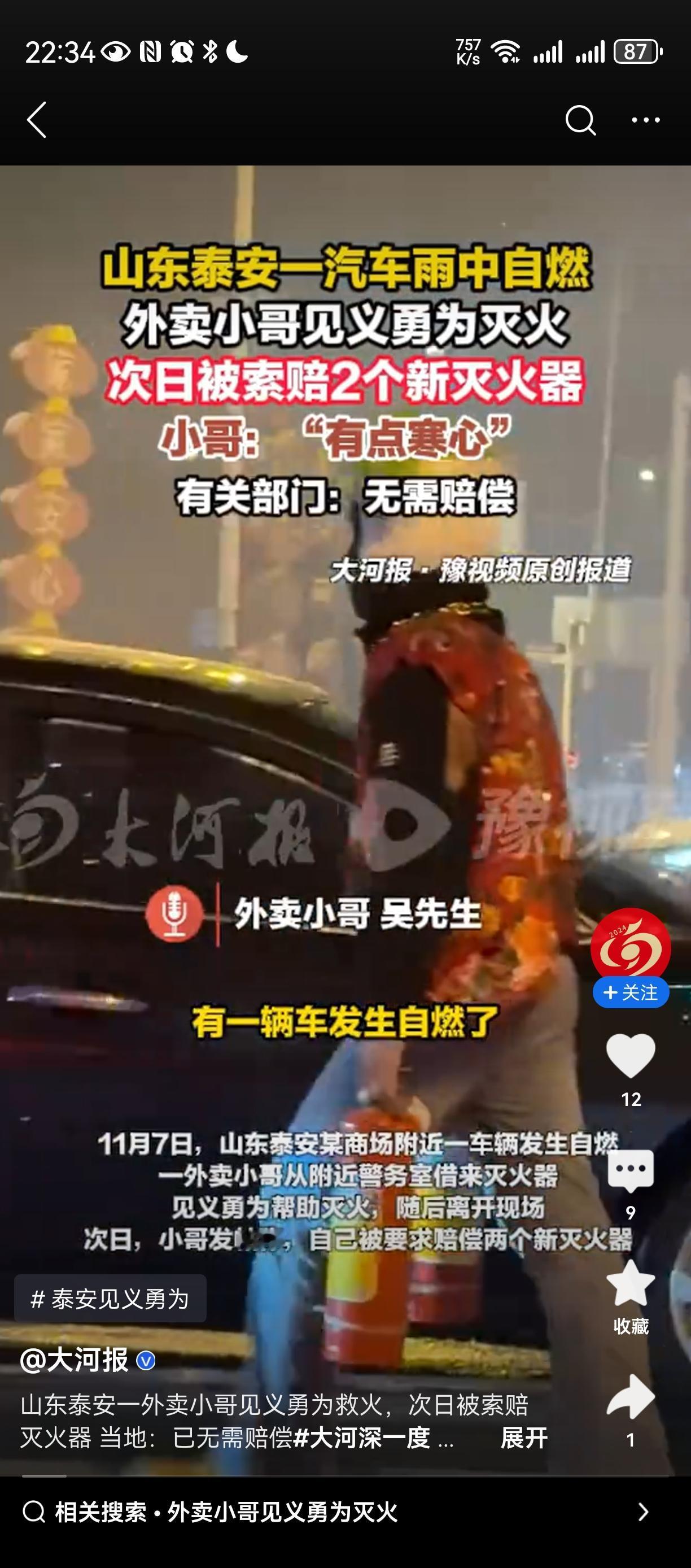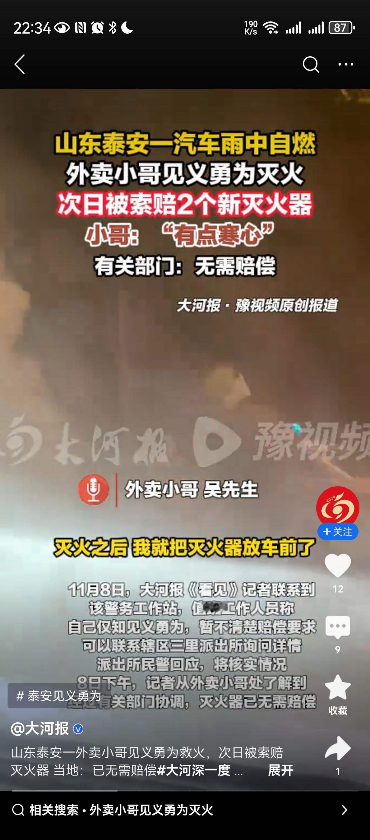 给外卖小哥点赞 宁愿自己不吃饭, 耽误一天的单子, 甚至已经超时了。 仍然决定用灭火器灭火, 把风险降到了最低状况。 外卖小哥 然而但是, 居然要他赔偿灭火器🧯? 什么骚操作???