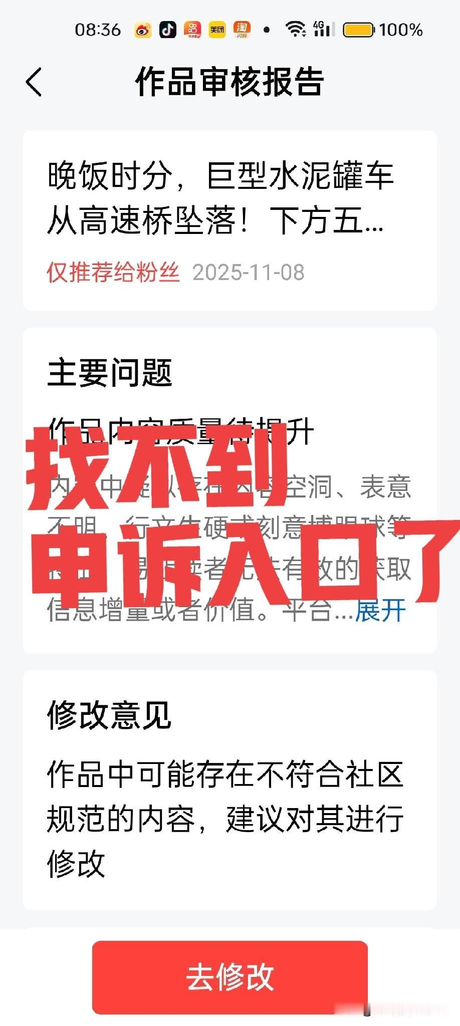 头条审核的“机器狗”真是越来越霸道了!内容被误判,连个讲理的地方都不给。昨天申诉入口还在,今天直接消失无踪,创作者的生死大权,全凭算法一念之间。 我们熬夜打磨的作品,可能因为机器一个误判就石沉大海,无处申冤。这种朝不保夕的创作环境,让人如履薄冰,热情都快被消磨殆尽。当沟通的桥梁被彻底斩断,留下的只有无处安放的焦虑和深深的无力感。这还如何让人安心创作? 友友们,你们的申诉入口还在不在,我今天早上接到审核通知,说作品违规了,我准备申诉,可发现没有申诉入口了[捂脸] 爆料
