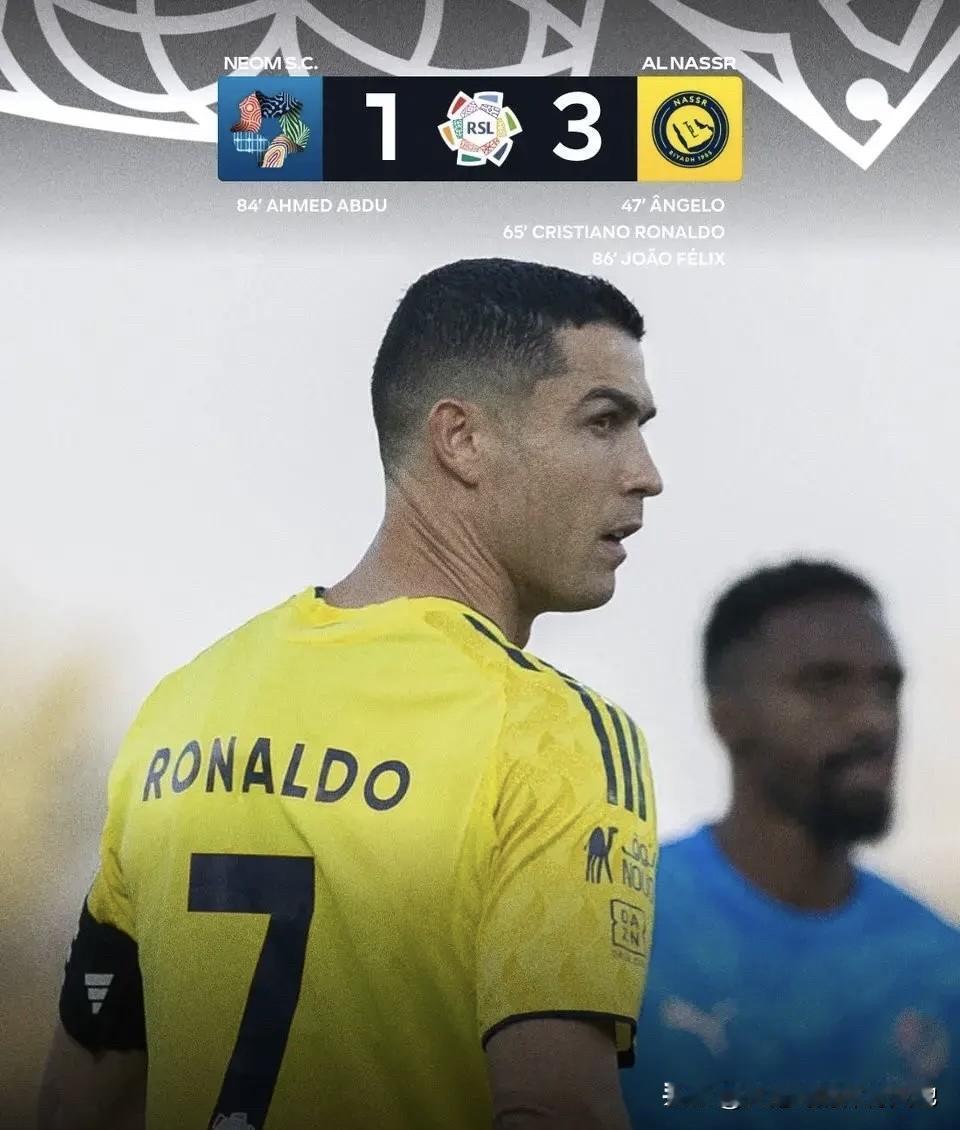 ——利雅得胜利客场3-1击败新未来城体育,C罗打入一粒点球,至此,C罗在沙特联赛85次出场已直接参与100球,包括83球17助。